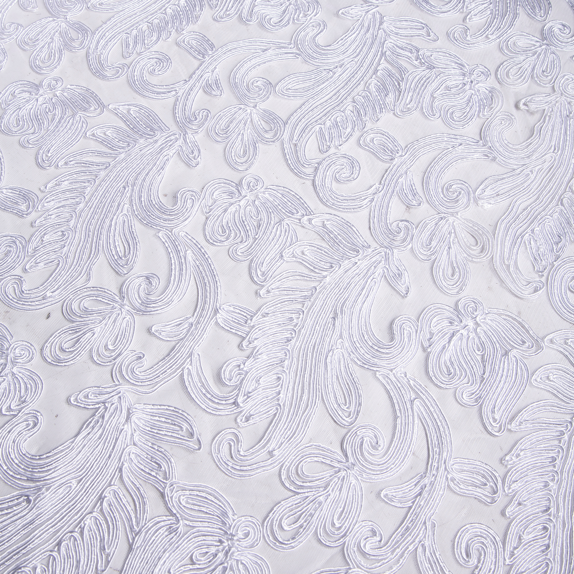 1,00μ φάρδος. Δαντέλα σε άσπρο χρώμα στην οποία απεικονίζονται λουλουδένια κι φυλλώδη μοτίβα. Έχει, επίσης, απαλή αλλά και έντονη ανάγλυφη αίσθηση. Με αυτήν μπορούν να ραφτούν ρούχα όπως νυφικά και βραδινά φορέματα. Προτείνεται πλύσιμο στο χέρι ή στεγνό καθάρισμα για την διατήρηση της υφής του