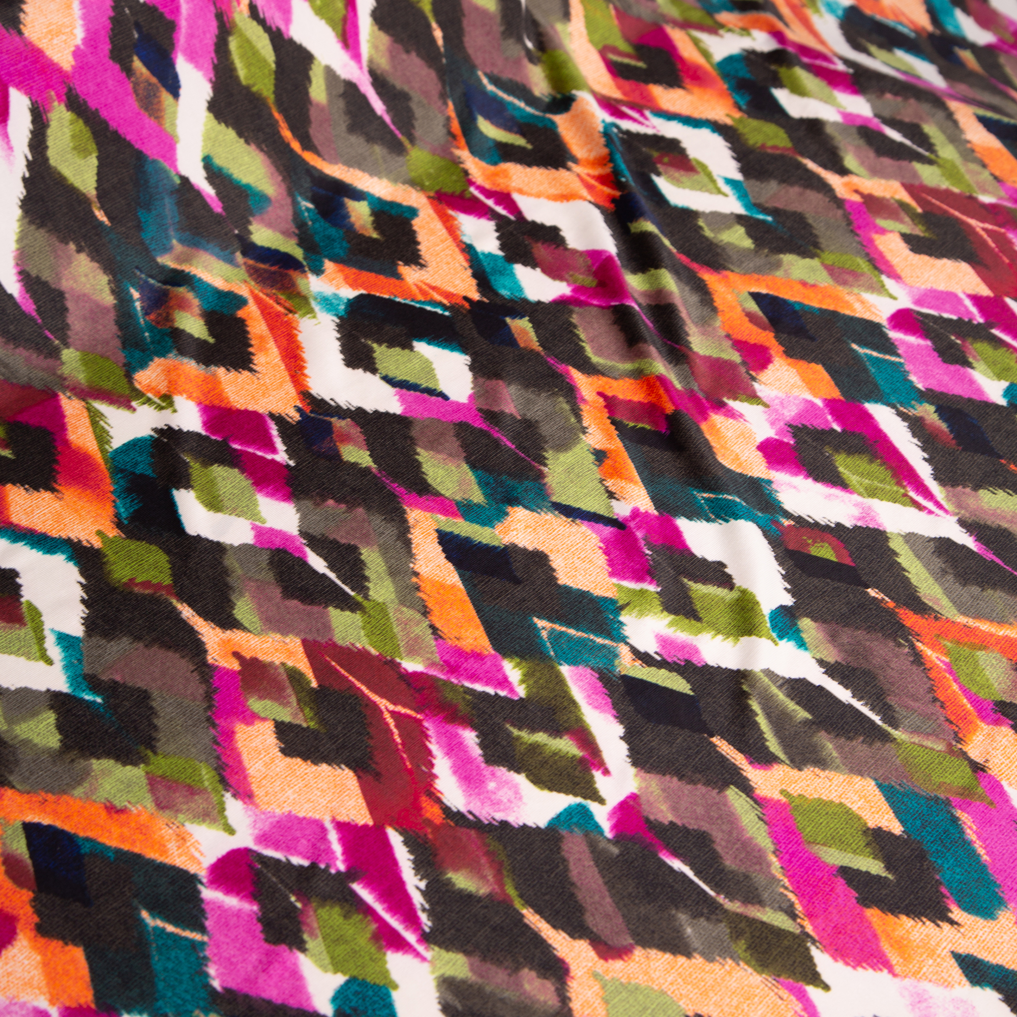 1.50 μ φάρδος. 94% πολυέστερ 6% spandex. Ύφασμα διπλής ελαστικότητας, τόσο ως προς το φάρδος, όσο και ως προς το μάκρος, στο οποίο απεικονίζεται γεωμετρικό σχέδιο με σχέδιο Ίκατ σε φούξια, κίτρινο, μπλε, πράσινους και πορτοκαλί τόνους. Διαθέτει απαλή υφή και δεν τσαλακώνει καθόλου. Πέρα από ρούχα μπορεί να χρησιμοποιηθεί και για την ραφή μαγιό, καθώς διαθέτει πυκνή υφή και στεγνώνει πολύ εύκολα. Σε αυτήν την περίπτωση ως εσωτερική επένδυση στο μαγιό μπορεί να μπει κάποια λίκρα ή κάποια ελαστική φόδρα.