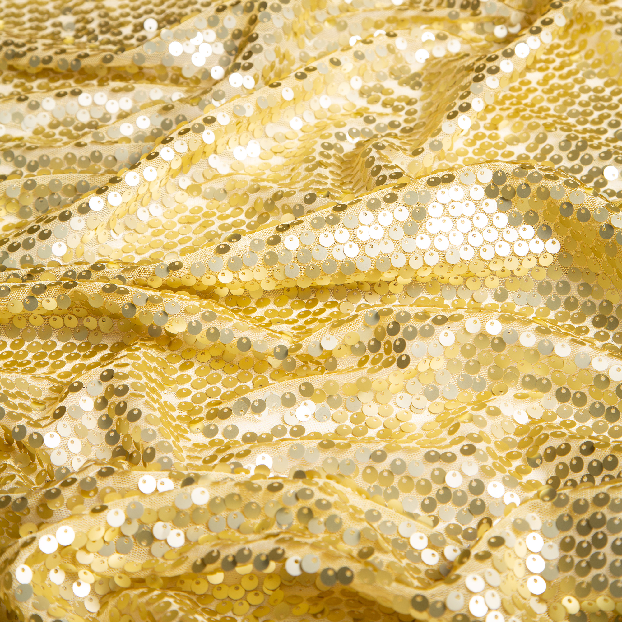 1,50μ φάρδος. 100% πολυέστερ. Παγιέτα με πυκνή επένδυση σε κίτρινο χρώμα η οποία είναι ραμμένη πάνω σε τούλι. Διαθέτει μία μικρή ελαστικότητα η οποία προσφέρει άνεση κινήσεων. Μπορεί να χρησιμοποιηθεί για βραδινά ρούχα, θεατρικές ενδυμασίες αλλά και στολισμούς, δίνοντας λάμψη σε όλες τις δημιουργίες. Συστήνεται πλύσιμο στο χέρι ή στεγνό καθάρισμα για μακροχρόνια ανθεκτικότητα