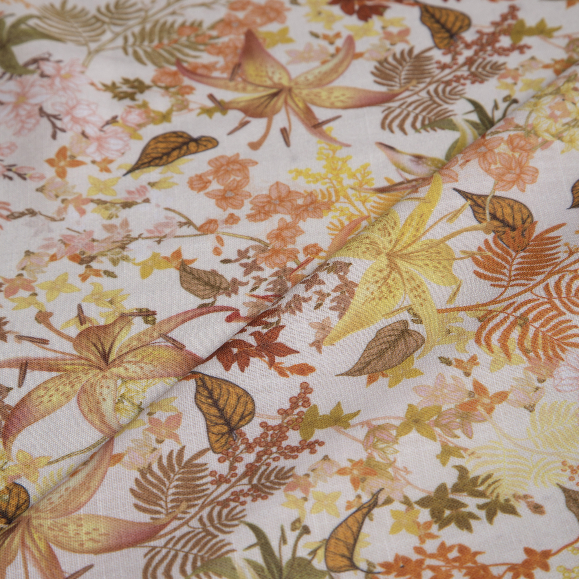 1.50μ φάρδος. 65% πολυέστερ 35% λινό. Ύφασμα στο οποίο απεικονίζεται floral σχέδιο σε κίτρινες και πορτοκαλί αποχρώσεις και άσπρη βάση. Έχει την ικανότητα να συνδυάζει την φυσική όψη του λινού και ταυτόχρονα την πρακτικότητα του πολυεστέρα. Έχει αίσθηση παρόμοια με αυτή το φυσικού λινού και δεν τσαλακώνει καθόλου. Αγκαλιάζει ομοιόμορφα το σώμα και δεν κολλάει πάνω σε αυτό. Τέλος, λόγω της σταθερότητας του ράβεται πολύ εύκολα και μπορεί να χρησιμοποιηθεί για την ραφή ρούχων, όπως φούστες, παντελόνες, φορέματα κ.α.
