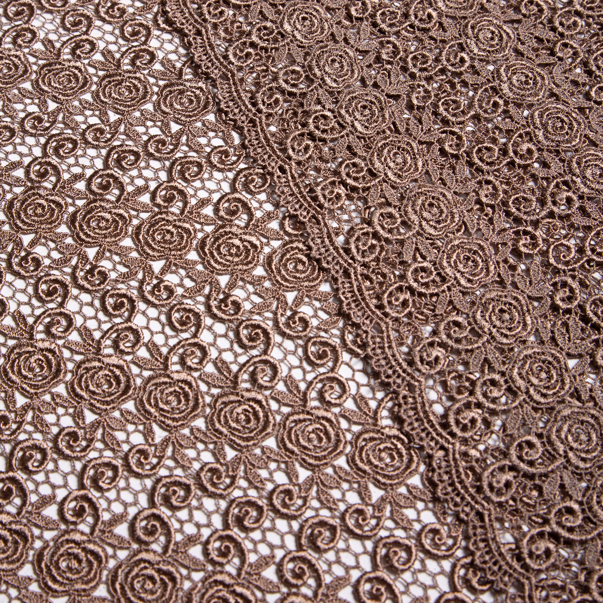 0,90μ φάρδος. Δαντέλα σε ανοιχτό καφέ χρώμα στην οποία απεικονίζονται σπείρες και λουλούδια με λεπτομερή κέντημα. Έχει, επίσης, απαλή αλλά και έντονη ανάγλυφη αίσθηση. Με αυτή μπορούν να ραφτούν βραδινά φορέματα και άλλα επίσημα ρούχα. Προτείνεται πλύσιμο στο χέρι ή στεγνό καθάρισμα για την διατήρηση της υφής του
