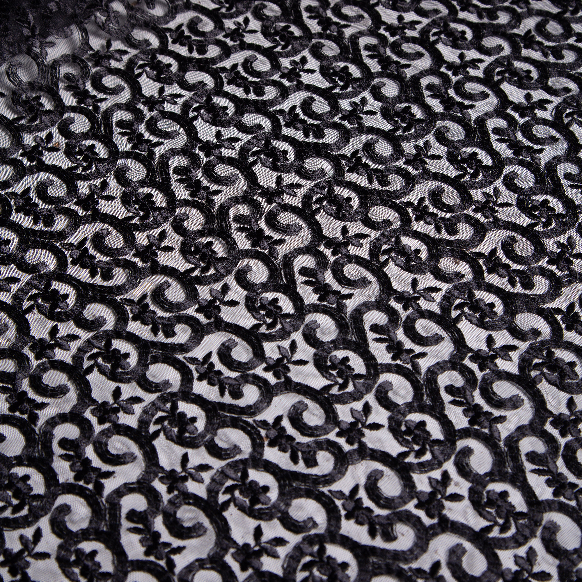 0,90μ φάρδος. Δαντέλα σε μαύρο χρώμα στην οποία απεικονίζονται στροβιλισμοί και λουλουδένια μοτίβα. Έχει, επίσης, απαλή αλλά και έντονη ανάγλυφη αίσθηση. Με αυτή μπορούν να ραφτούν βραδινά φορέματα και άλλα επίσημα ρούχα. Προτείνεται πλύσιμο στο χέρι ή στεγνό καθάρισμα για την διατήρηση της υφής του