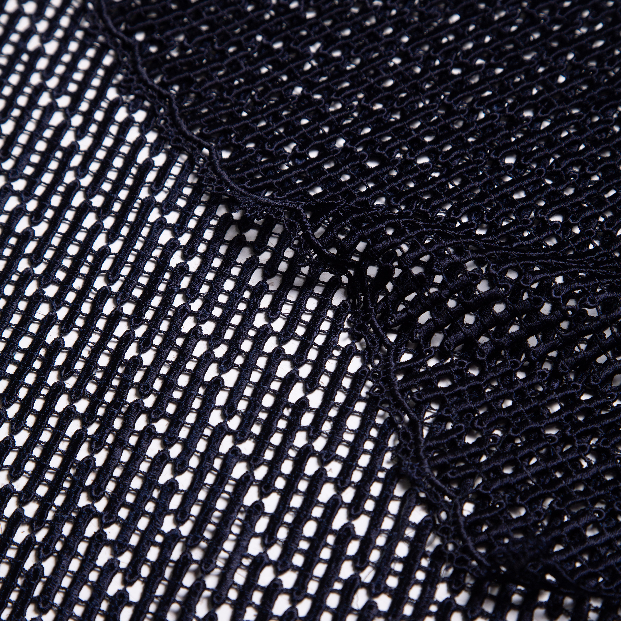 0,90μ φάρδος. Πλεκτή δαντέλα σε μπλε σκούρο χρώμα στην οποία απεικονίζεται γεωμετρικό μοτίβο. Έχει, επίσης, απαλή αλλά και έντονη ανάγλυφη αίσθηση. Με αυτή μπορούν να ραφτούν βραδινά φορέματα και άλλα επίσημα ρούχα. Προτείνεται πλύσιμο στο χέρι ή στεγνό καθάρισμα για την διατήρηση της υφής του