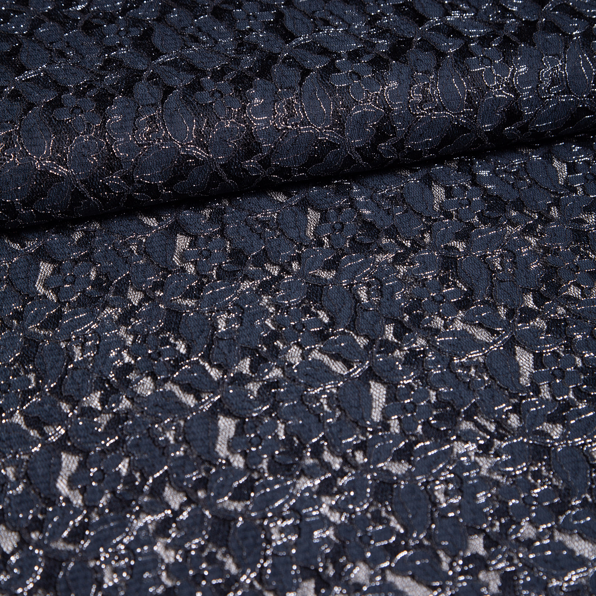 1,50μ φάρδος. Δαντέλα σε μπλε σκούρο χρώμα στην οποία απεικονίζονται λουλουδένια μοτίβα με ασημένιες πινελιές. Έχει, επίσης, απαλή αλλά και έντονη ανάγλυφη αίσθηση. Με αυτή μπορούν να ραφτούν βραδινά φορέματα και άλλα επίσημα ρούχα. Προτείνεται πλύσιμο στο χέρι ή στεγνό καθάρισμα για την διατήρηση της υφής του