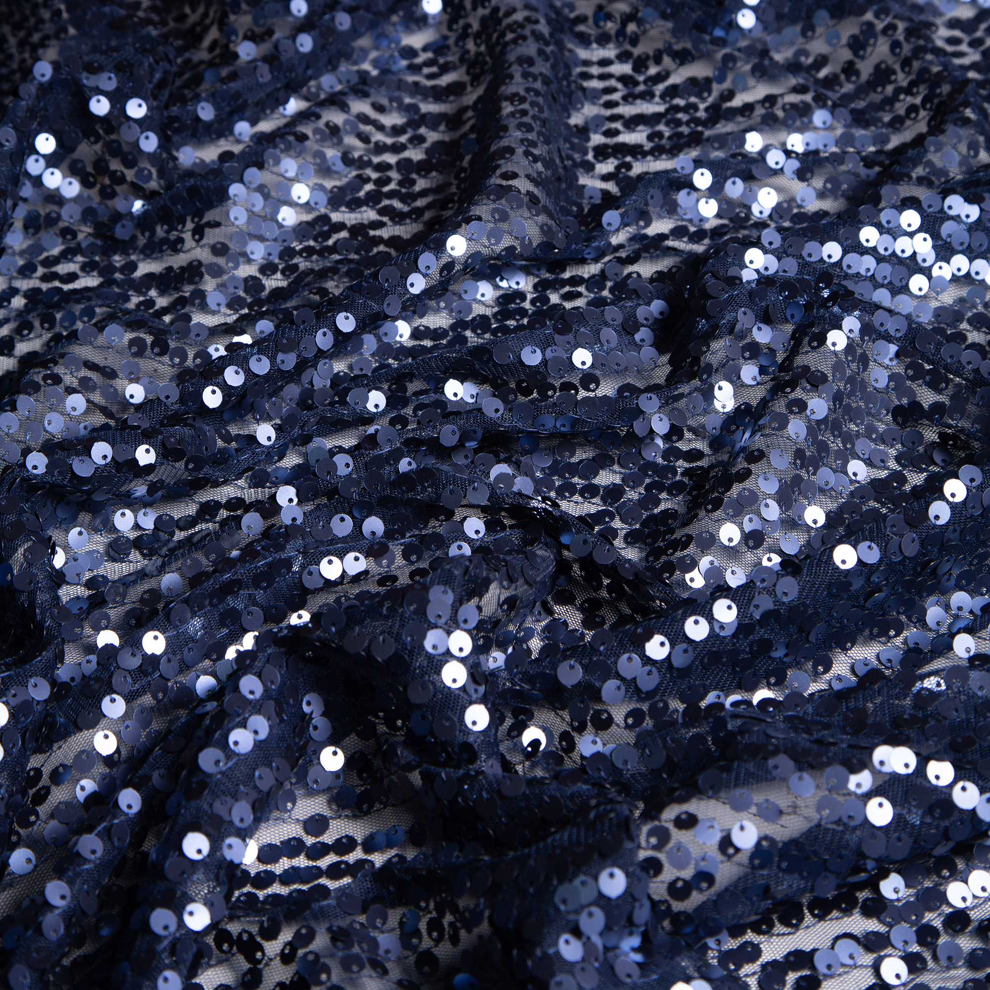 1,50μ φάρδος. 100% πολυέστερ. Παγιέτα με πυκνή επένδυση σε μπλε σκούρο χρώμα η οποία είναι ραμμένη πάνω σε τούλι. Διαθέτει μία μικρή ελαστικότητα η οποία προσφέρει άνεση κινήσεων. Μπορεί να χρησιμοποιηθεί για βραδινά ρούχα, θεατρικές ενδυμασίες αλλά και στολισμούς, δίνοντας λάμψη σε όλες τις δημιουργίες. Συστήνεται πλύσιμο στο χέρι ή στεγνό καθάρισμα για μακροχρόνια ανθεκτικότητα