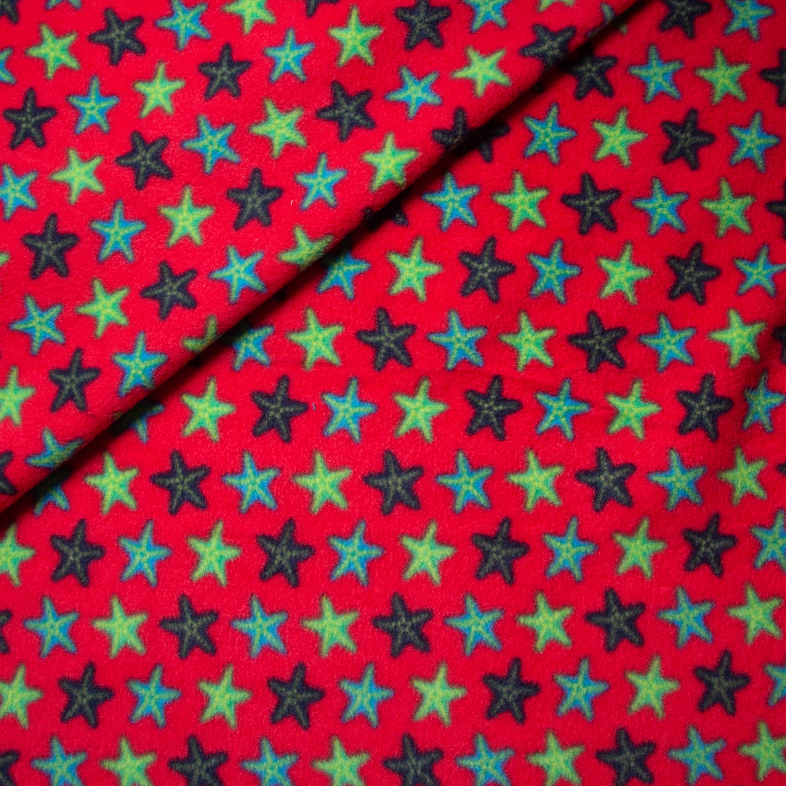 1.50 μ φάρδος. 100% πολυέστερ. Στο φόντο απεικονίζονται επαναλαμβανόμενα μοτίβα από αστέρια σε πράσινες και μπλε αποχρώσεις με κόκκινη βάση. Ύφασμα μεσαίου πάχους, το οποίο διαθέτει κοντό τρίχωμα. Έχει αρκετή ελαστικότητα ως προς το φάρδος και δεν ξεχειλώνει καθόλου. Είναι ζεστό, πολύ απαλό στην αφή και ανθεκτικό. Μπορεί να χρησιμοποιηθεί, για την ραφή ρούχων, για πιτζάμες, για κουβέρτες, καλύμματα κ.α. Πλένεται στους 30°C