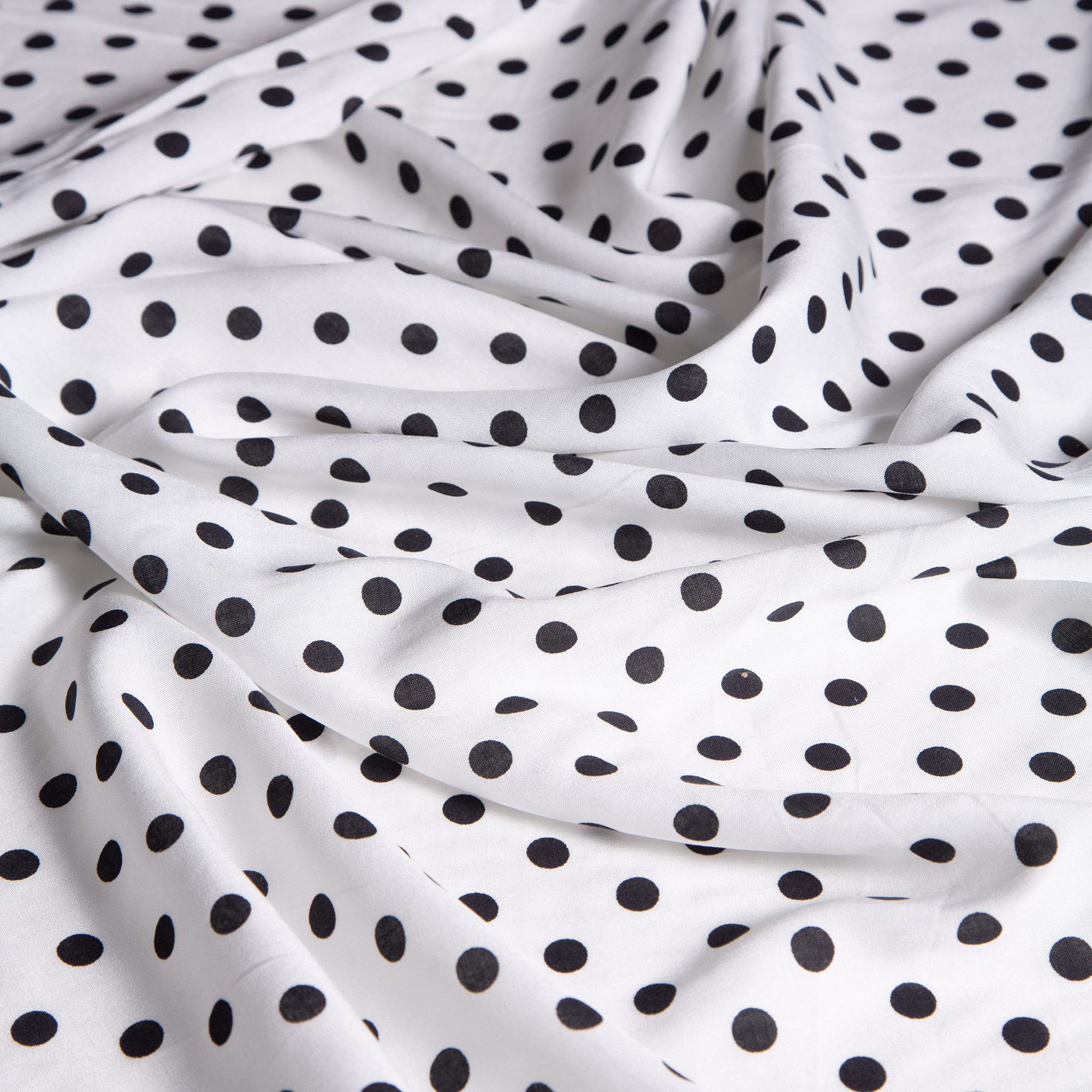 1,50 μ φάρδος. 100% βισκόζη. Απεικονίζεται μαύρο πουά σε λευκό φόντο. Βασικά χαρακτηριστικά του υφάσματος είναι η φυσική υφή και η μαλακή αίσθηση που προσφέρει. Είναι απαλή και λεία βοηθώντας παράλληλα το σώμα να αναπνέει. Πέφτει πολύ ωραία έχοντας αέρινη και ανάλαφρη κίνηση. Τέλος, απορροφά τον υγρασία κάτι που την καθιστά την καταλληλότερη, ίσως, επιλογή για τους ζεστούς καλοκαιρινούς μήνες. Δεν δυσκολεύει στο ράψιμο και με αυτήν μπορούν να δημιουργηθούν ρούχα όπως κιμονό, παντελόνια, πουκάμισα, μπλούζες, φούστες κ.α.