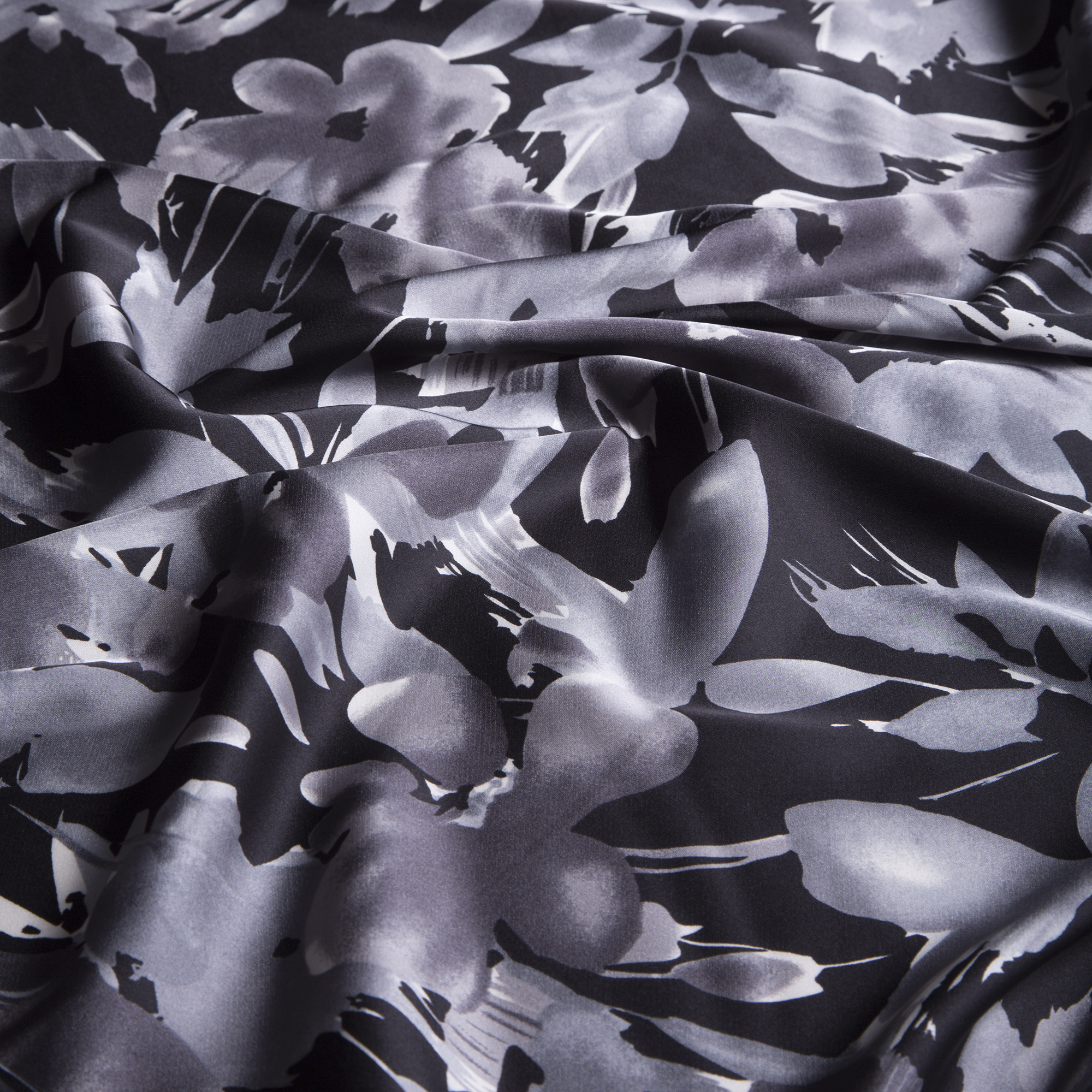 1,50 μ φάρδος. 95% πολυέστερ 5% spandex. Ύφασμα με μεγάλα λουλούδια σε γκρι αποχρώσεις πάνω σε μαύρο φόντο. Είναι λαμπερό και λείο με πολύ απαλή υφή, παρόμοια με αυτή του μεταξιού. Η ελαστικότητα που διαθέτει προσφέρει άνεση κινήσεων, χωρίς να δημιουργεί ζάρες. Έχει εξαιρετική εφαρμογή πάνω στο σώμα και πέφτει ανάλαφρα. Όλα τα παραπάνω το καθιστούν κατάλληλο για την ραφή ρούχων όπως πουκάμισα, φορέματα, μπλούζες, παντελόνες, φούστες κ.α