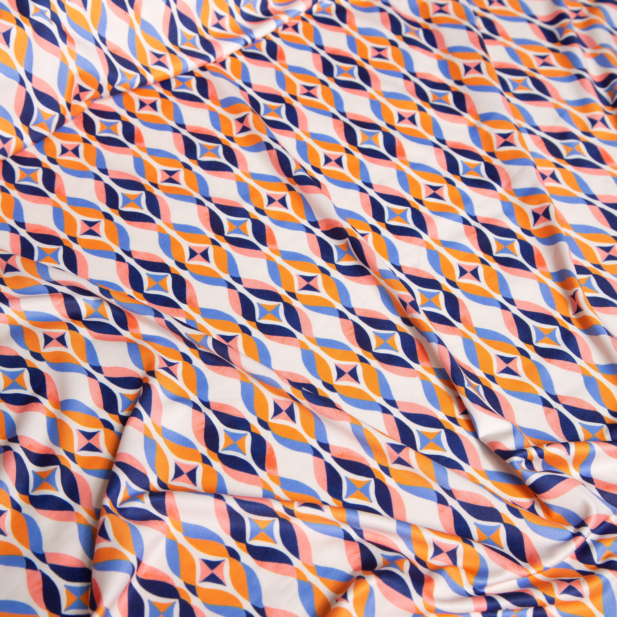 1.50 μ φάρδος. 94% πολυέστερ 6% spandex. Ύφασμα διπλής ελαστικότητας, τόσο ως προς το φάρδος, όσο και ως προς το μάκρος, στο οποίο απεικονίζεται γεωμετρικό σχέδιο με επαναλαμβανόμενα μοτίβα σε πορτοκαλί, ροζ, μπλε και λευκές αποχρώσεις. Διαθέτει απαλή υφή και δεν τσαλακώνει καθόλου. Πέρα από ρούχα μπορεί να χρησιμοποιηθεί και για την ραφή μαγιό, καθώς διαθέτει πυκνή υφή και στεγνώνει πολύ εύκολα. Σε αυτήν την περίπτωση ως εσωτερική επένδυση στο μαγιό μπορεί να μπει κάποια λίκρα ή κάποια ελαστική φόδρα.