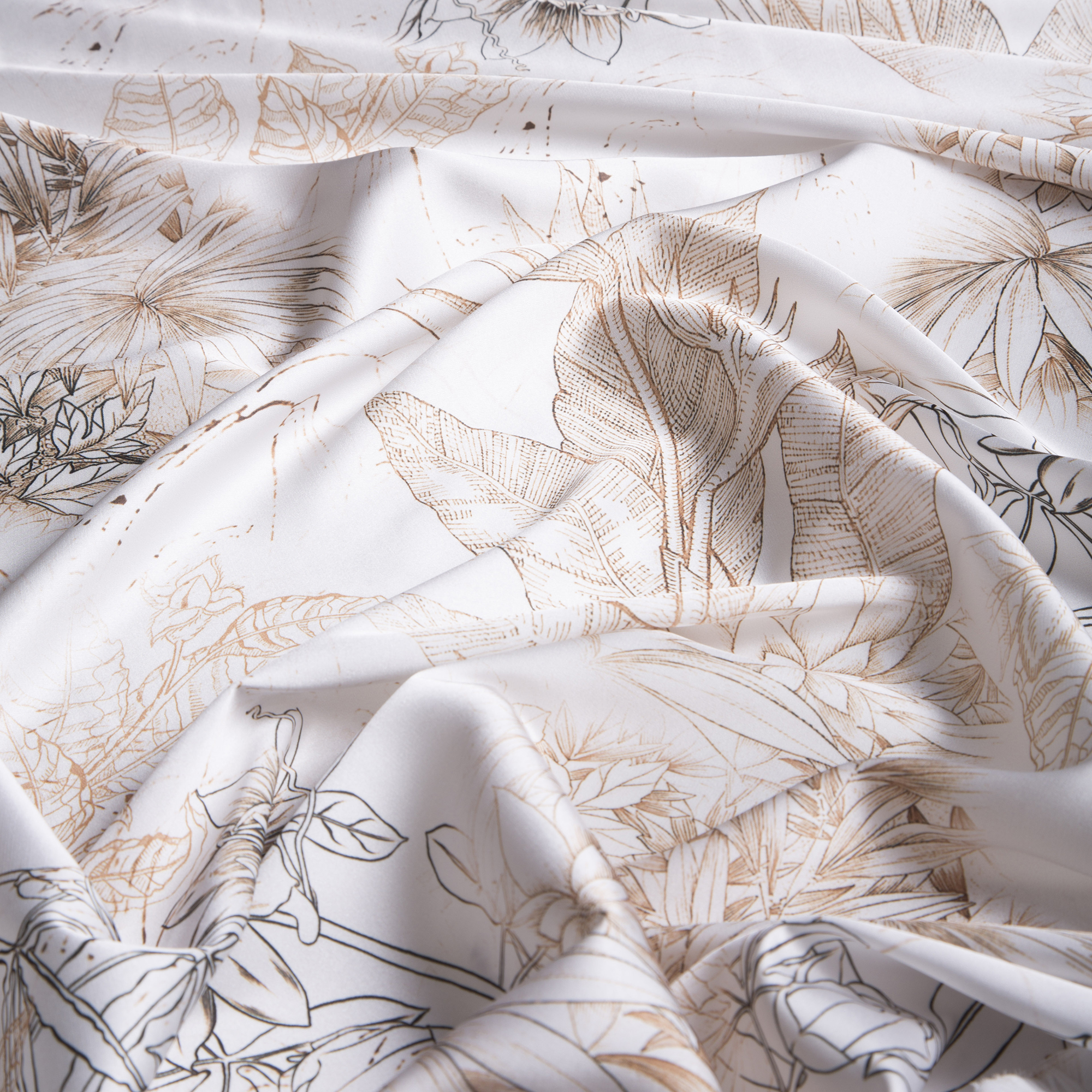 1,50 μ φάρδος. 95% πολυέστερ 5% spandex. Ύφασμα με γραμμικές απεικονίσεις φύλλων και φυτών σε καφέ και μαύρες αποχρώσεις πάνω σε άσπρο φόντο. Είναι λαμπερό και λείο με πολύ απαλή υφή, παρόμοια με αυτή του μεταξιού. Η ελαστικότητα που διαθέτει προσφέρει άνεση κινήσεων, χωρίς να δημιουργεί ζάρες. Έχει εξαιρετική εφαρμογή πάνω στο σώμα και πέφτει ανάλαφρα. Όλα τα παραπάνω το καθιστούν κατάλληλο για την ραφή ρούχων όπως πουκάμισα, φορέματα, μπλούζες, παντελόνες, φούστες κ.α