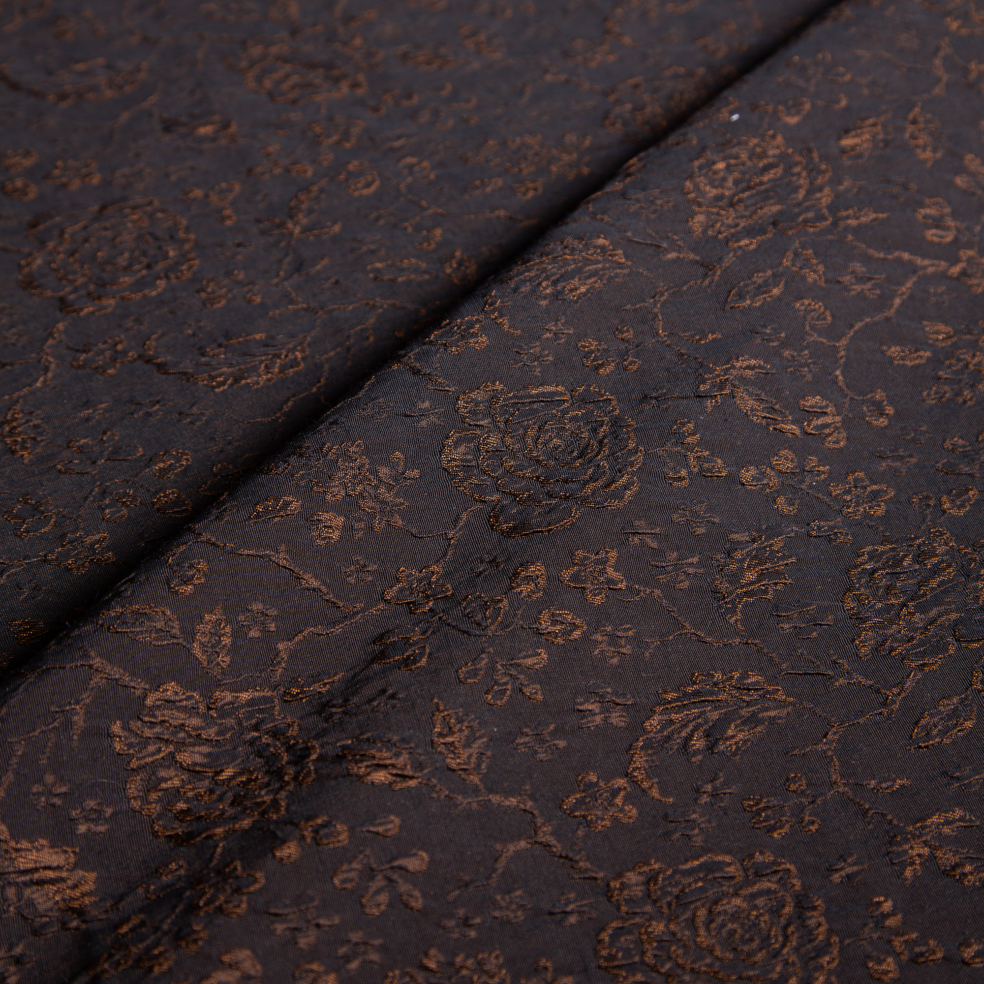1.30 μ φάρδος. 100% πολυέστερ υψηλής ποιότητας. Ύφασμα με σκούρα σοκολατί καφέ βάση με μεταλλικές μπρονζέ λεπτομέρειες. Στην επιφάνεια του υπάρχουν μικρά και μεσσαία λουλούδια. Το χαρακτηριστικό που ξεχωρίζει την συγκεκριμένη ποιότητα από όλα τα υπόλοιπα αμπιγιέ υφάσματα είναι ότι τα σχέδια δεν έχουν τυπωθεί στην επιφάνεια του αλλά έχουν ραφτεί πάνω σε αυτήν. Διαθέτει, επίσης, πλούσια υφή και εμφάνιση, κάτι που προσφέρει μια αίσθηση πολυτέλειας. Είναι στητό και η ύφανση του σφιχτή. Με αυτό μπορούν να ραφτούν σακάκια, φορέματα, παραδοσιακές και θεατρικές στολές κ.α