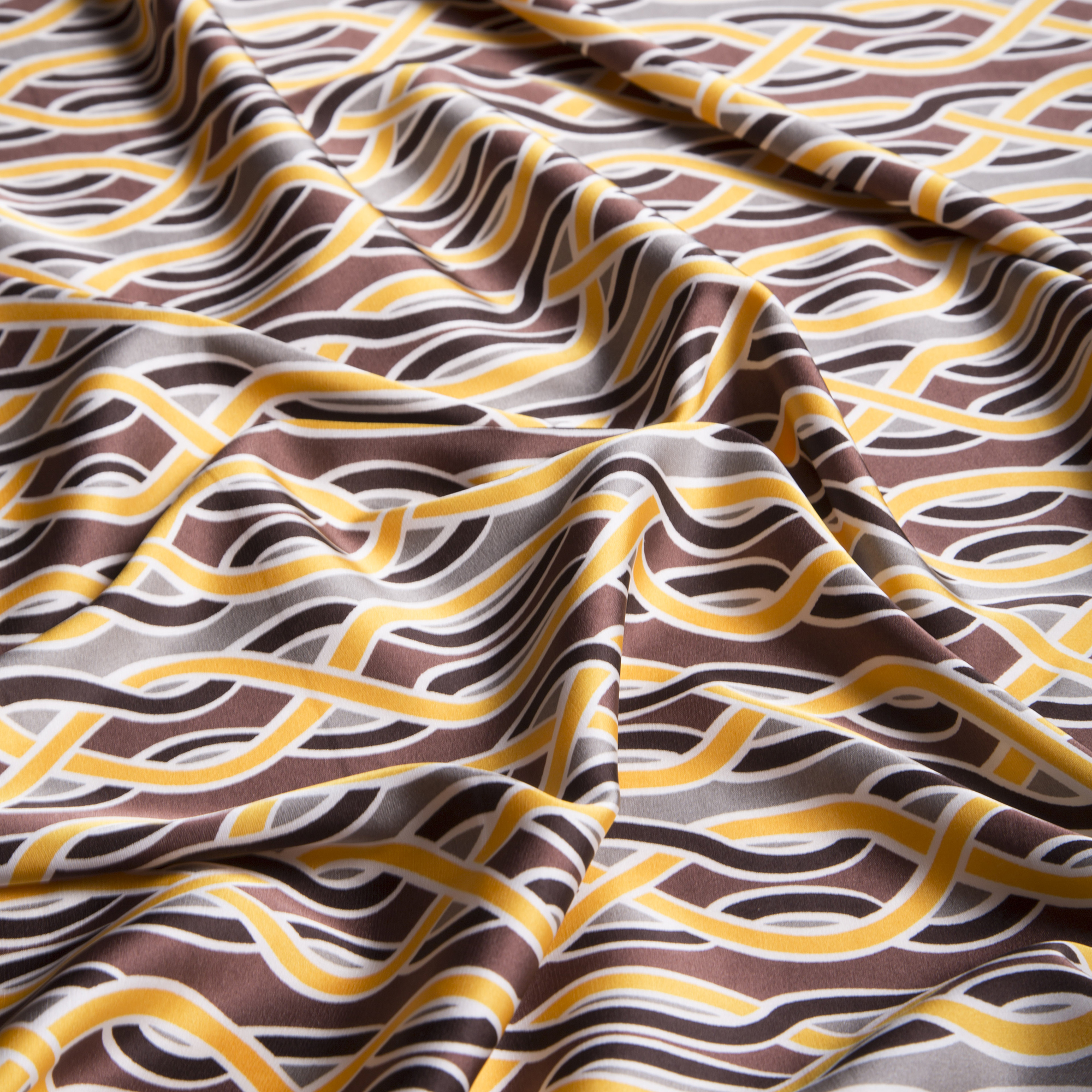 1,50 μ φάρδος. 95% πολυέστερ 5% spandex. Ύφασμα με κυματιστές γραμμές σε καφέ και κίτρινες αποχρώσεις με καφέ και γκρι φόντο. Είναι λαμπερό και λείο με πολύ απαλή υφή, παρόμοια με αυτή του μεταξιού. Η ελαστικότητα που διαθέτει προσφέρει άνεση κινήσεων, χωρίς να δημιουργεί ζάρες. Έχει εξαιρετική εφαρμογή πάνω στο σώμα και πέφτει ανάλαφρα. Όλα τα παραπάνω το καθιστούν κατάλληλο για την ραφή ρούχων όπως πουκάμισα, φορέματα, μπλούζες, παντελόνες, φούστες κ.α