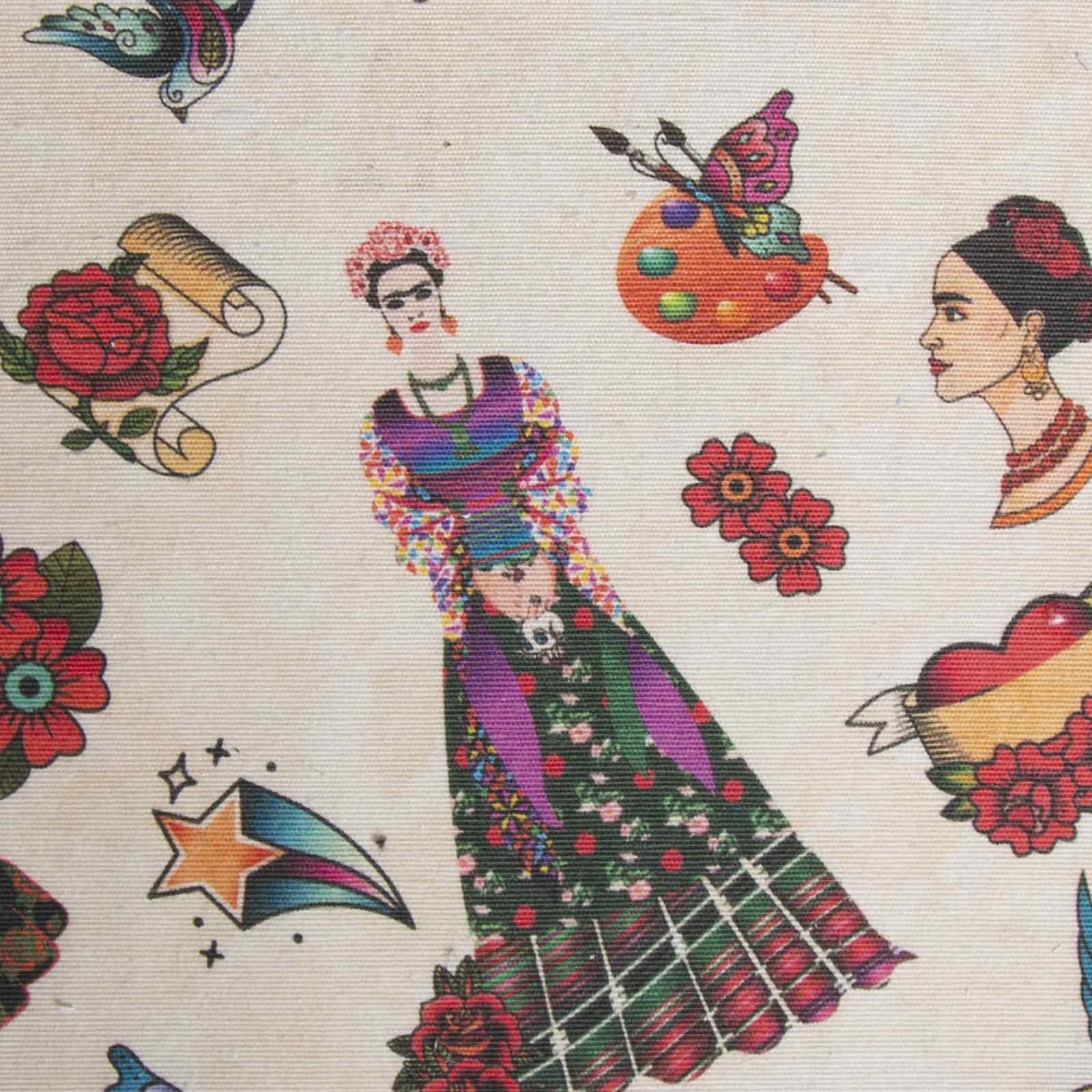 2,80 Μ φάρδος . 65% βαμβάκι 35% πολυέστερ. Στο φόντο απεικονίζονται γυναικείες φιγούρες εμπνευσμένες από την Frida Kahlo, καθώς επίσης και διάφορα λουλούδια, καρδιές, κορδέλες κ.α σε αποχρώσεις του μωβ, του κόκκινου, του πράσινου, του πορτοκαλί και του τυρκουάζ και βάση σε μπεζ. Ύφασμα με απαλή αίσθηση και μεγάλη ανθεκτικότητα, το οποίο είναι εύκολο στην συντήρηση και στο σιδέρωμα. Η καθημερινή χρήση δεν το ταλαιπωρεί και μπορεί να χρησιμοποιηθεί για την ραφή καλυμμάτων καναπέδων για μαξιλάρια, κουρτίνες , τραπεζομάντηλα, χειροτεχνίες και κάθε είδους DIY έργα, όπως τσάντες. Δεν προτείνεται για την ραφή ριχταριών, καθώς τσαλακώνει.