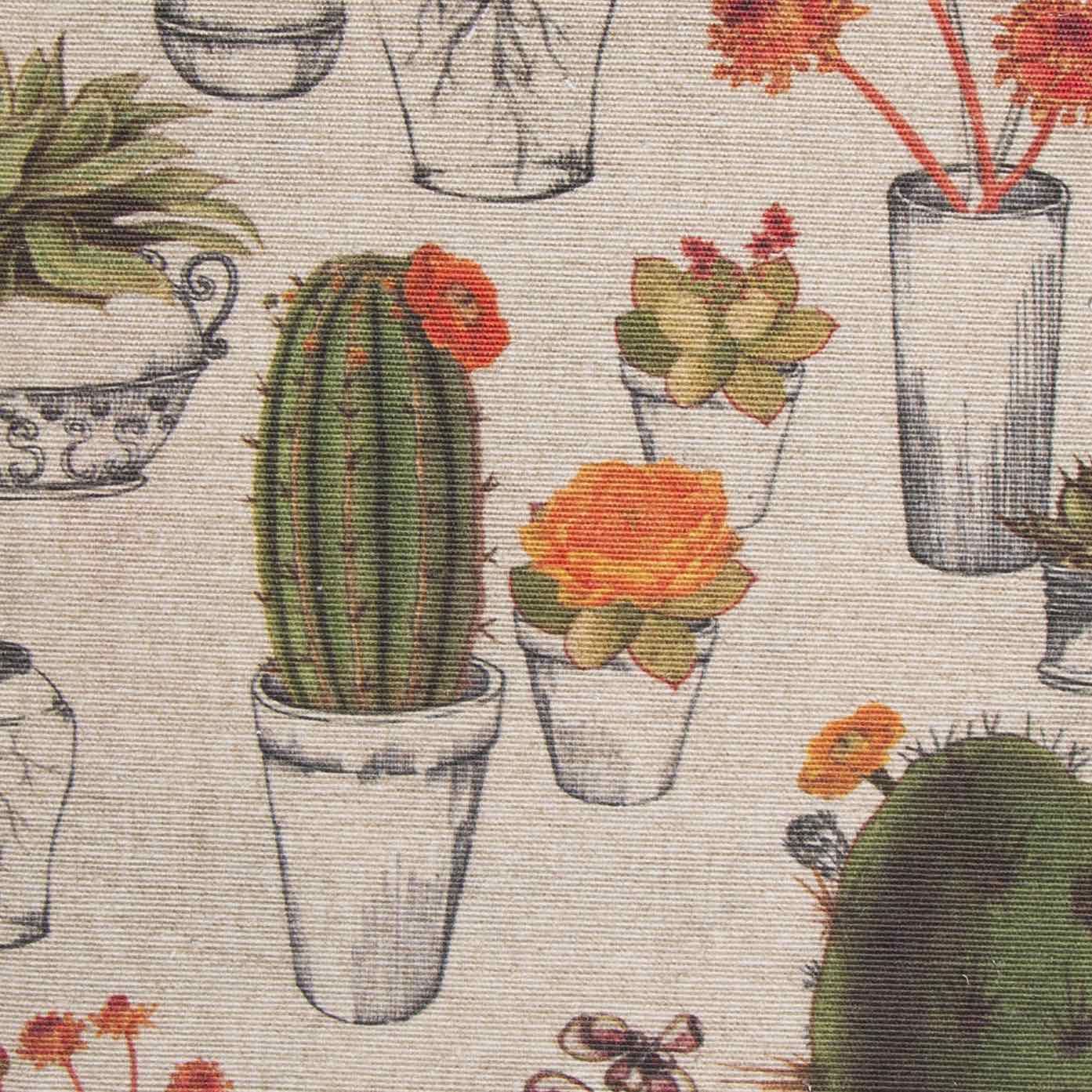 2,80 Μ φάρδος . 65% βαμβάκι 35% πολυέστερ. Στο φόντο απεικονίζονται γλάστρες με φυτά και κάκτους σε πορτοκαλί, πράσινες και γκρι αποχρώσεις με μπεζ βάση. Ύφασμα με απαλή αίσθηση και μεγάλη ανθεκτικότητα, το οποίο είναι εύκολο στην συντήρηση και στο σιδέρωμα. Η καθημερινή χρήση δεν το ταλαιπωρεί και μπορεί να χρησιμοποιηθεί για την ραφή καλυμμάτων καναπέδων για μαξιλάρια, κουρτίνες , τραπεζομάντηλα, χειροτεχνίες και κάθε είδους DIY έργα, όπως τσάντες. Δεν προτείνεται για την ραφή ριχταριών, καθώς τσαλακώνει.