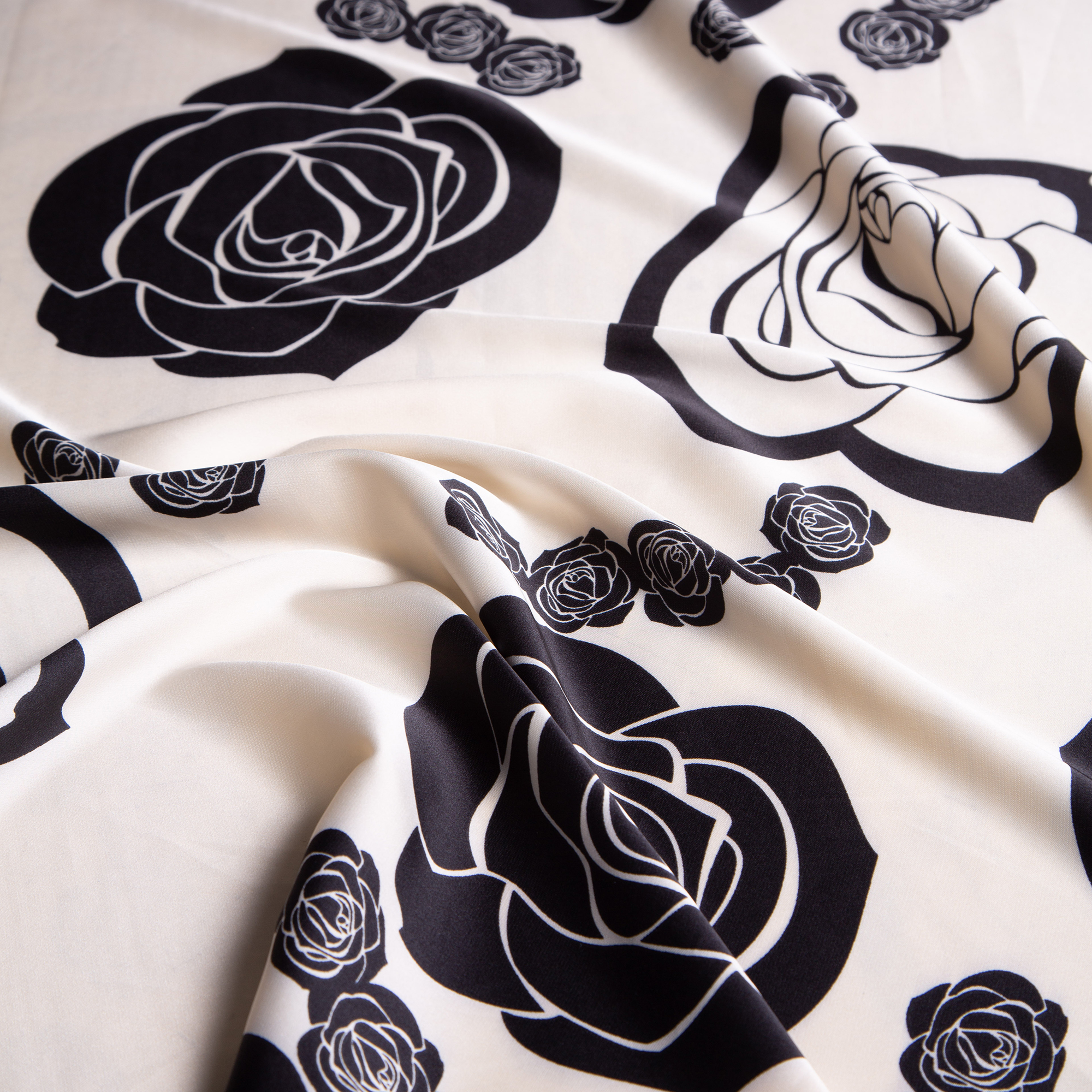 1,50 μ φάρδος. 95% πολυέστερ 5% spandex. Ύφασμα με μεγάλα γραμμικά τριαντάφυλλα που εναλλάσσονται σε soft nude και μαύρο χρώμα με soft nude φόντο. Είναι λαμπερό και λείο με πολύ απαλή υφή, παρόμοια με αυτή του μεταξιού. Η ελαστικότητα που διαθέτει προσφέρει άνεση κινήσεων, χωρίς να δημιουργεί ζάρες. Έχει εξαιρετική εφαρμογή πάνω στο σώμα και πέφτει ανάλαφρα. Όλα τα παραπάνω το καθιστούν κατάλληλο για την ραφή ρούχων όπως πουκάμισα, φορέματα, μπλούζες, παντελόνες, φούστες κ.α