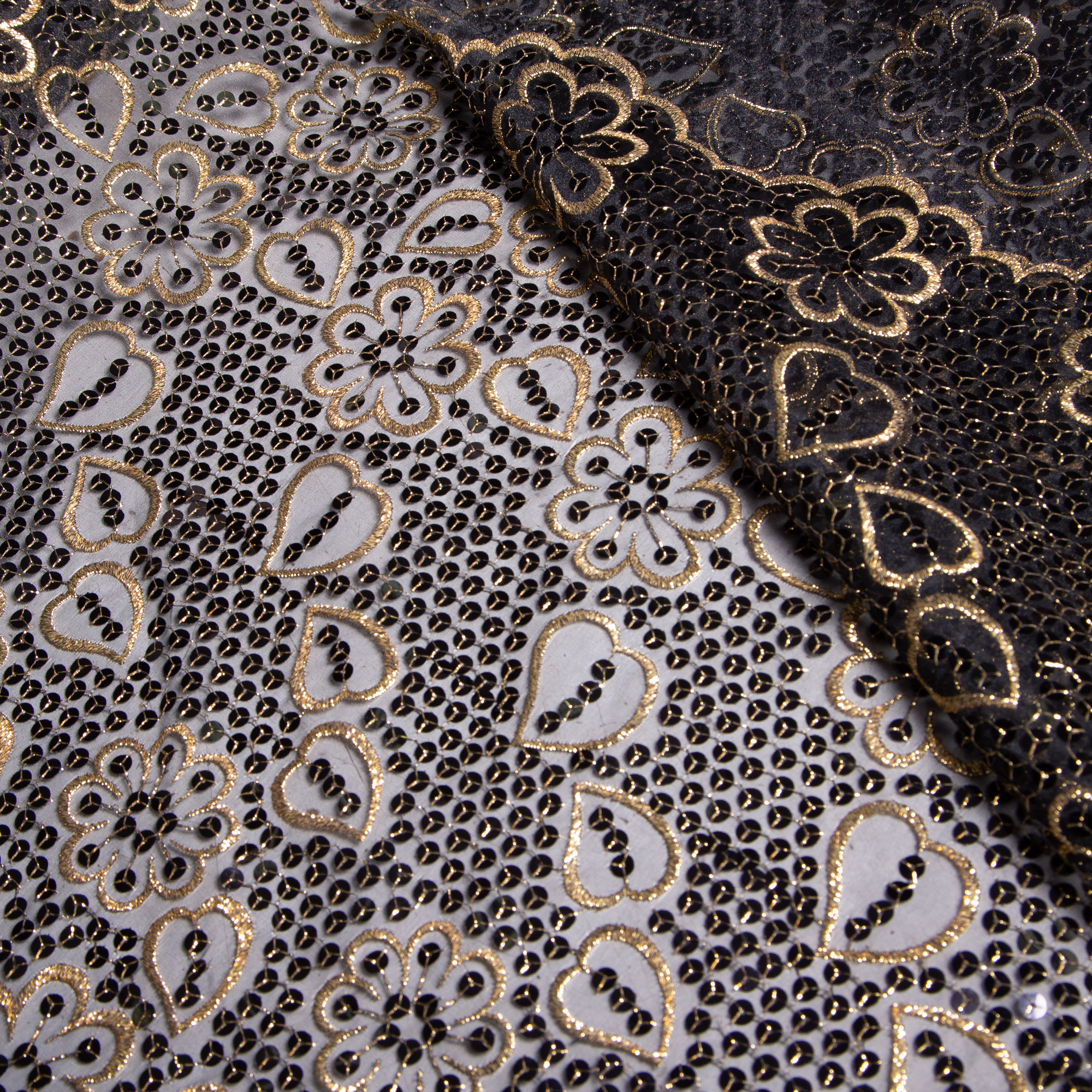 0,90 μ φάρδος. 100% πολυέστερ. Παγιέτα σε μαύρο και χρυσό χρώμα, η οποία διαθέτει λουλουδένια μοτίβα με καρδιές και άνθη. Η υφή της είναι ανάγλυφη με έντονη λάμψη. Με αυτή μπορούν να ραφτούν επίσημα ρούχα και προτείνεται στεγνό καθάρισμα ή πολύ προσεκτικό πλύσιμο στο χέρι