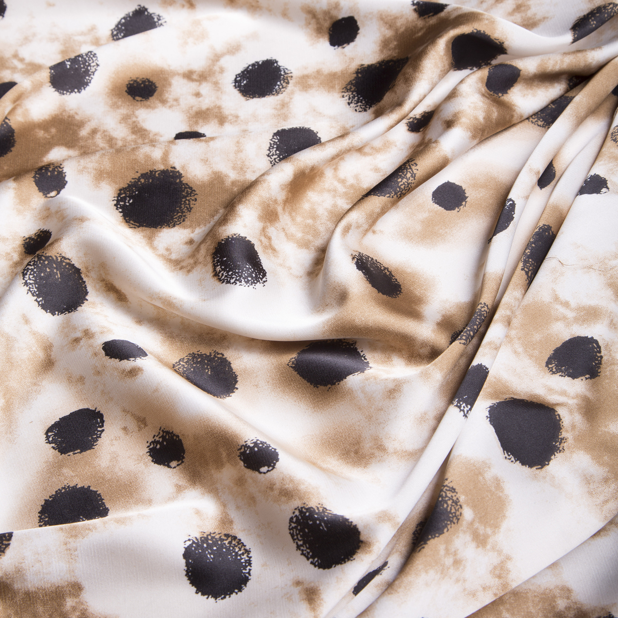 1,50 μ φάρδος. 95% πολυέστερ 5% spandex. Ύφασμα με μαύρα πουά πάνω σε μπεζ φόντο με ντεγκραντέ εφέ. Είναι λαμπερό και λείο με πολύ απαλή υφή, παρόμοια με αυτή του μεταξιού. Η ελαστικότητα που διαθέτει προσφέρει άνεση κινήσεων, χωρίς να δημιουργεί ζάρες. Έχει εξαιρετική εφαρμογή πάνω στο σώμα και πέφτει ανάλαφρα. Όλα τα παραπάνω το καθιστούν κατάλληλο για την ραφή ρούχων όπως πουκάμισα, φορέματα, μπλούζες, παντελόνες, φούστες κ.α
