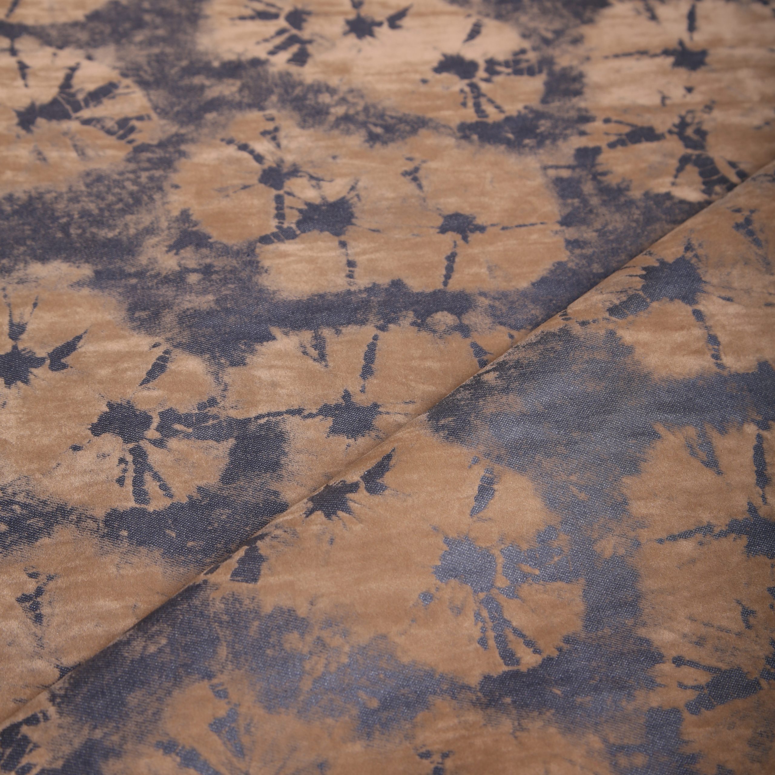 1.50μ φάρδος. 100% βαμβάκι με επίστρωση βελούδου και tie dye σχέδιο (τεχνική βαψίματος κατά το οποίο το ύφασμα στρίβεται και τσαλακώνεται σε διάφορα σημεία πριν βαφτεί, και αυτά δεν απορροφούν το χρώμα με τον ίδιο τρόπο με αποτέλεσμα να δημιουργούνται διαφορετικά μοτίβα). Το τζιν αποτελεί ένα από τα πιο διαχρονικά και αγαπημένα υφάσματα, στον χώρο της μόδας. Χάρη στην χαρακτηριστική διαγώνια πλέξη του προσφέρει εξαιρετική αντοχή, διατηρώντας παράλληλα άνετη εφαρμογή. Διαθέτει, επίσης, μεγάλη διάρκεια ζωής και ευχάριστη υφή. Είναι πανεύκολο στο ράψιμο και μπορεί να χρησιμοποιηθεί τόσο στον χώρο της μόδας, όσο και στον χώρο των κατασκευών. Προτείνεται τις πρώτες φορές να πλένεται μόνο του, καθώς θα βγάζει χρώμα.