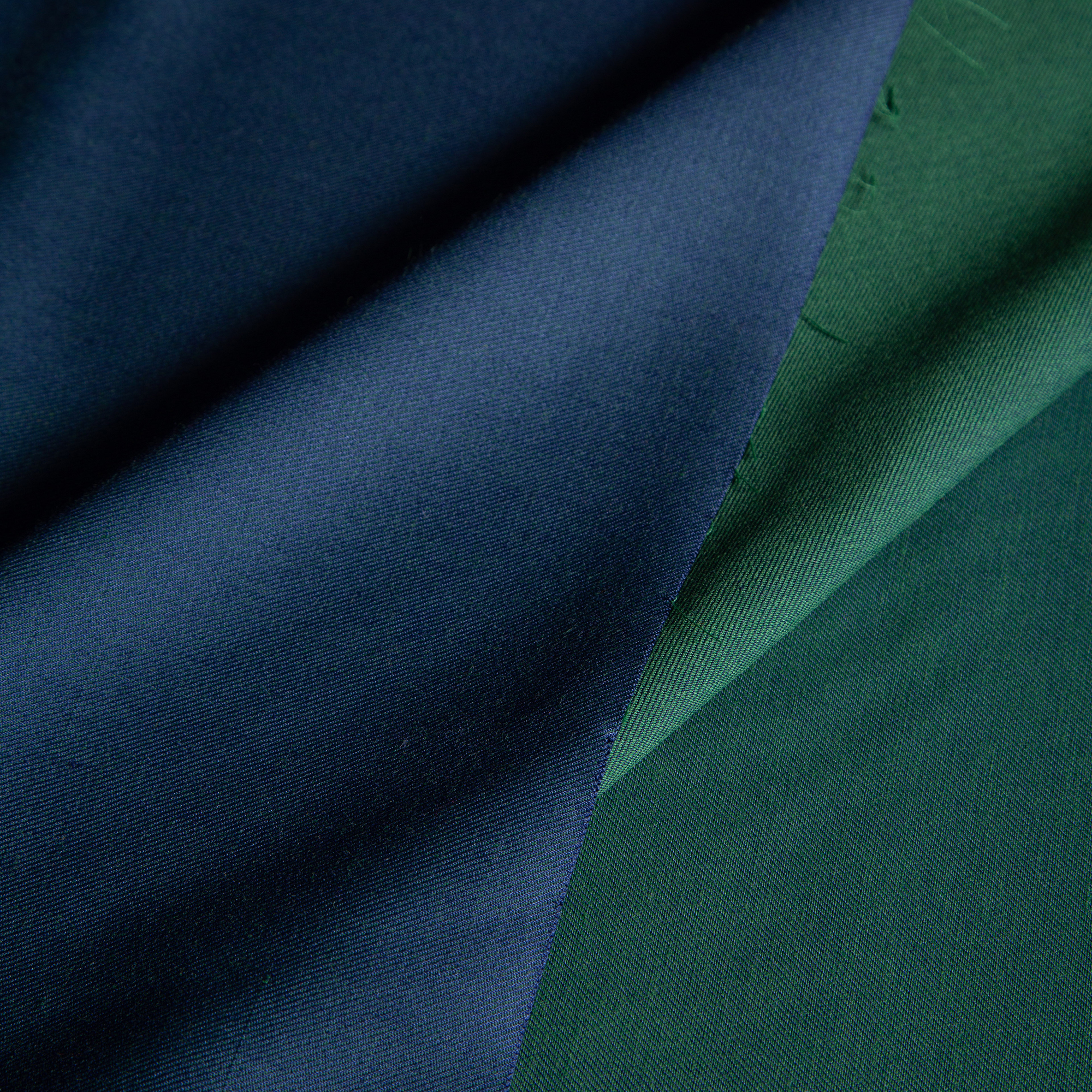 1,50μ φάρδος.45% μαλλί 55% τερυλέν. Ύφασμα εξαιρετικής ποιότητας, διπλής όψεως σε μπλε και πράσινο χρώμα, που διαθέτει μαλακή και λεία υφή. Η ύπαρξη του μαλλιού βοηθάει το σώμα να αναπνέει και απορροφά τον ιδρώτα, ενώ ο πολυεστέρας το καθιστά ιδιαίτερα ανθεκτικό. Δεν τσαλακώνει και μπορεί να χρησιμοποιηθεί για την ραφή ανδρικών και γυναικείων κουστουμιών, για φορέματα. φούστες κ.α. Προτείνεται στεγνό καθάρισμα.