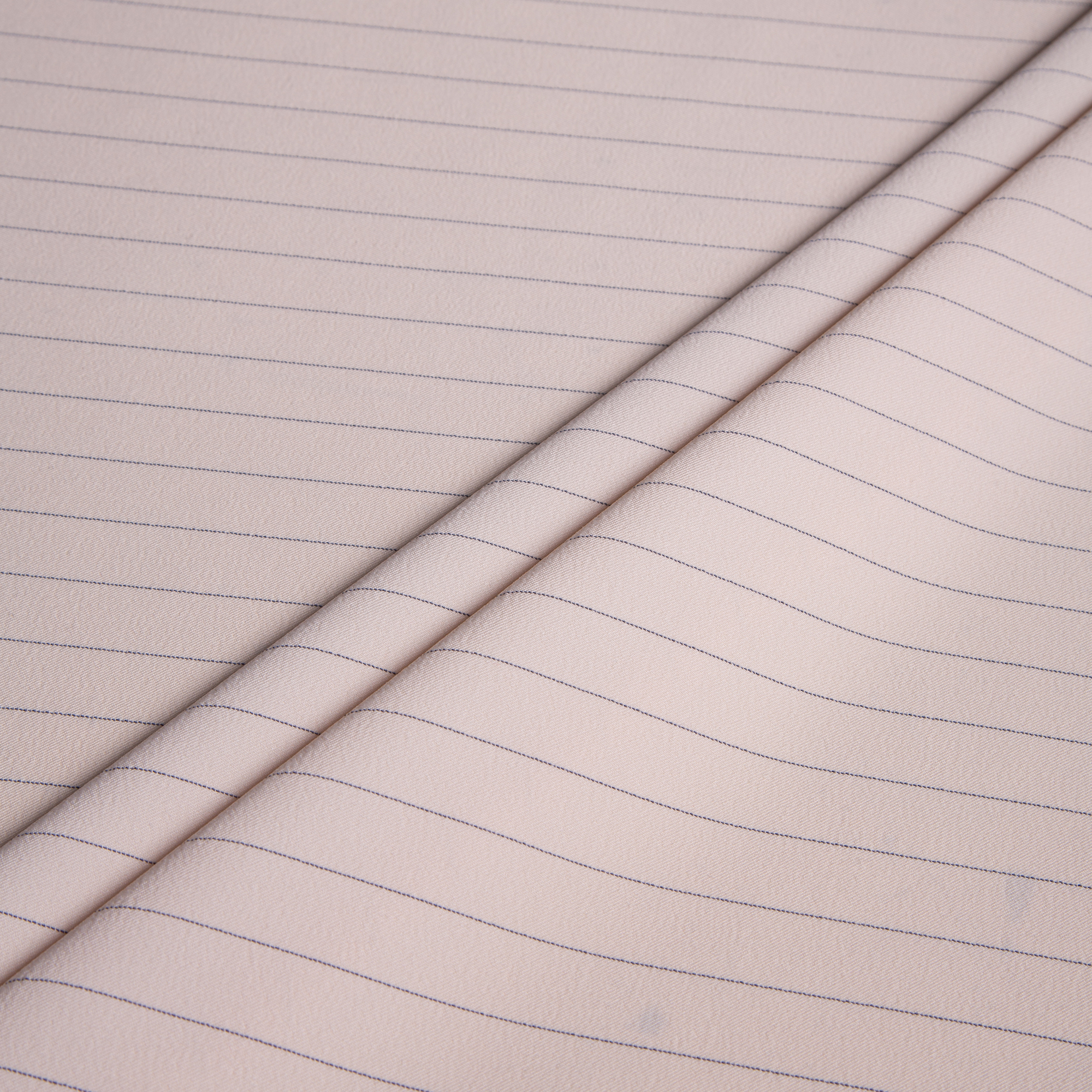 1,50 μ φάρδος. 90% πολυέστερ 10% ελαστίνη. Στο συγκεκριμένο ύφασμα απεικονίζεται ριγέ σχέδιο με ρίγα σε μπλε χρώμα και βάση σε μπεζ απαλό. Τα κρεπ υφάσματα χαρακτηρίζονται από ματ και σπασμένη όψη. Η ελαστικότητα που διαθέτουν προσφέρει τέλεια εφαρμογή και άνεση κινήσεων. Δεν γλιστράνε καθόλου πάνω στο σώμα και δεν τσαλακώνουν. Είναι κατάλληλα για την ραφή πάσης φύσεως ρούχων, όπως παντελόνια, φούστες κτλ.