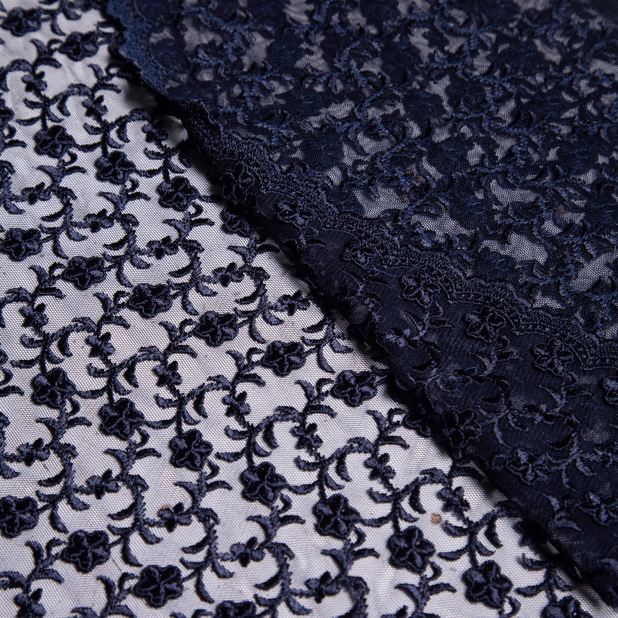 0,90μ φάρδος. Δαντέλα σε μπλε σκούρο χρώμα στην οποία απεικονίζεται ανάγλυφα λουλουδένια μοτίβα με περίτεχνες λεπτομέρειες. Έχει, επίσης, απαλή αλλά και έντονη ανάγλυφη αίσθηση. Με αυτή μπορούν να ραφτούν βραδινά φορέματα και άλλα επίσημα ρούχα. Προτείνεται πλύσιμο στο χέρι ή στεγνό καθάρισμα για την διατήρηση της υφής του