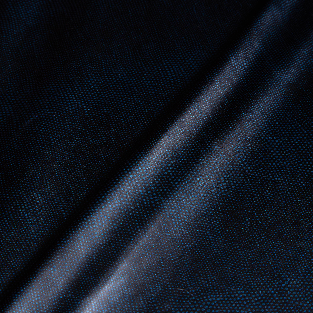 1.50 μ φάρδος. Απεικονίζεται πουά εφε σε μπλε απόχρωση. Foil ονομάζονται τα υφάσματα που διαθέτουν μια λεπτή στρώση μεταλλικού φίλμ, η οποία προσδίδει μια μεταλλιζέ και καθρεπτίζουσα εμφάνιση. Το ύφασμα βάσης είναι δερματίνη. Μπορεί να χρησιμοποιηθεί για την ραφή εντυπωσιακών ρούχων όπως φορέματα, φούστες κτλ, αλλά και για διακοσμήσεις. Χρειάζεται προσοχή στο ράψιμο αλλά και στο πλύσιμο. Προτείνεται στεγνό καθάρισμα ή καθαριστήριο.