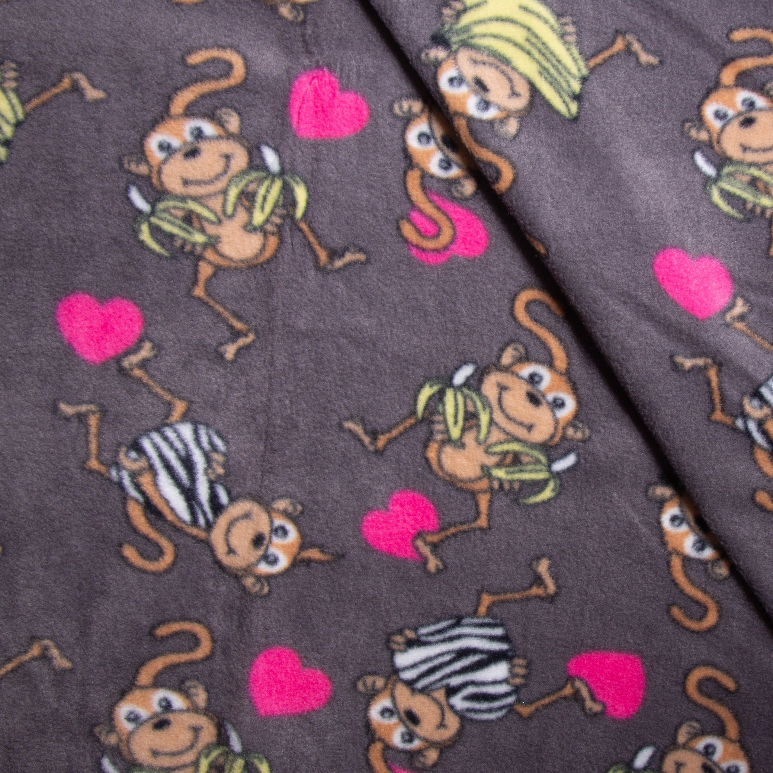 1.50 μ φάρδος. 100% πολυέστερ. Στο φόντο απεικονίζονται χαρούμενα μαϊμουδάκια καρδιές και λεπτομέρειες σε ροζ, καφέ και κίτρινες αποχρώσεις και βάση γκρι σκούρα. Ύφασμα μεσαίου πάχους, το οποίο διαθέτει κοντό τρίχωμα. Έχει αρκετή ελαστικότητα ως προς το φάρδος και δεν ξεχειλώνει καθόλου. Είναι ζεστό, πολύ απαλό στην αφή και ανθεκτικό. Μπορεί να χρησιμοποιηθεί, για την ραφή ρούχων, για πιτζάμες, για κουβέρτες, καλύμματα κ.α. Πλένεται στους 30°C
