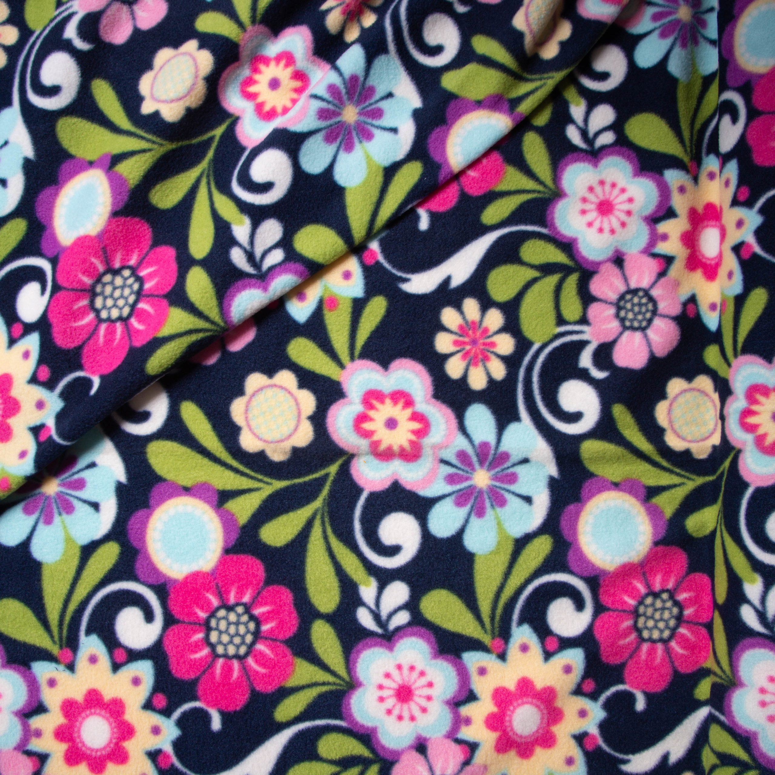 1.50 μ φάρδος. 100% πολυέστερ. Στο φόντο απεικονίζονται πολύχρωμα μικρά και μεγάλα λουλούδια σε ροζ, τιρκουάζ, κίτρινες και πράσινες αποχρώσεις και μπλε σκούρα βάση. Ύφασμα μεσαίου πάχους, το οποίο διαθέτει κοντό τρίχωμα. Έχει αρκετή ελαστικότητα ως προς το φάρδος και δεν ξεχειλώνει καθόλου. Είναι ζεστό, πολύ απαλό στην αφή και ανθεκτικό. Μπορεί να χρησιμοποιηθεί, για την ραφή ρούχων, για πιτζάμες, για κουβέρτες, καλύμματα κ.α. Πλένεται στους 30°C