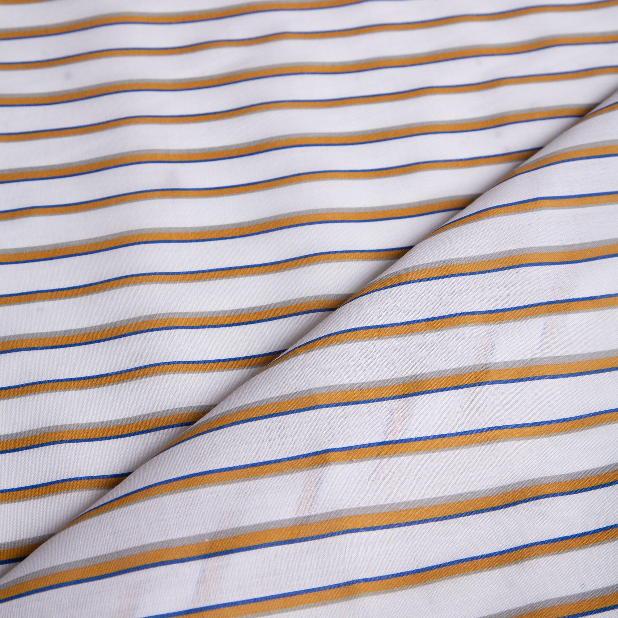 1,50 μ φάρδος. 100% βαμβάκι. Στο συγκεκριμένο σχέδιο απεικονίζεται ριγέ σε αποχρώσεις του μουσταρδί, του μπλε και του λευκού. Τα κυριότερα χαρακτηριστικά της ποπλίνας είναι η απαλή της υφή, η ελαφρότητα της και η εξαιρετική διαπνοή που προσφέρει. Δημιουργεί μια πολύ ευχάριστη αίσθηση κατά την επαφή με το δέρμα κάτι που την καθιστά κατάλληλη για ραφές που απαιτούν άνεση και κομψότητα. Συνιστάται πλύσιμο σε χαμηλούς βαθμούς.