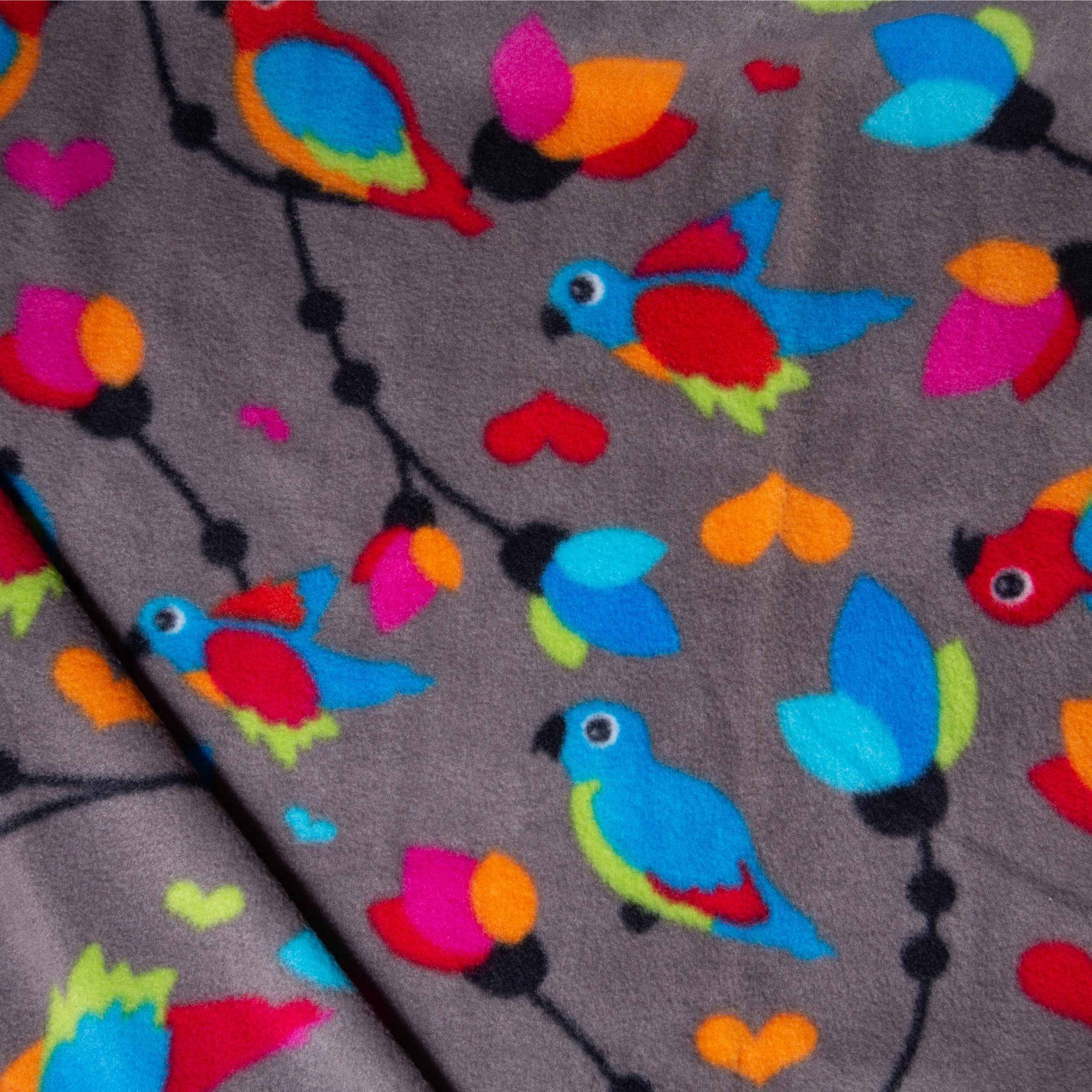 1.50 μ φάρδος. 100% πολυέστερ. Στο φόντο απεικονίζεται παιχνιδιάρικο μοτίβο από πολύχρωμα πουλάκια, φύλλα και καρδιές σε κόκκινες, μπλε, κίτρινες και φούξια αποχρώσεις και γκρι βάση. Ύφασμα μεσαίου πάχους, το οποίο διαθέτει κοντό τρίχωμα. Έχει αρκετή ελαστικότητα ως προς το φάρδος και δεν ξεχειλώνει καθόλου. Είναι ζεστό, πολύ απαλό στην αφή και ανθεκτικό. Μπορεί να χρησιμοποιηθεί, για την ραφή ρούχων, για πιτζάμες, για κουβέρτες, καλύμματα κ.α. Πλένεται στους 30°C