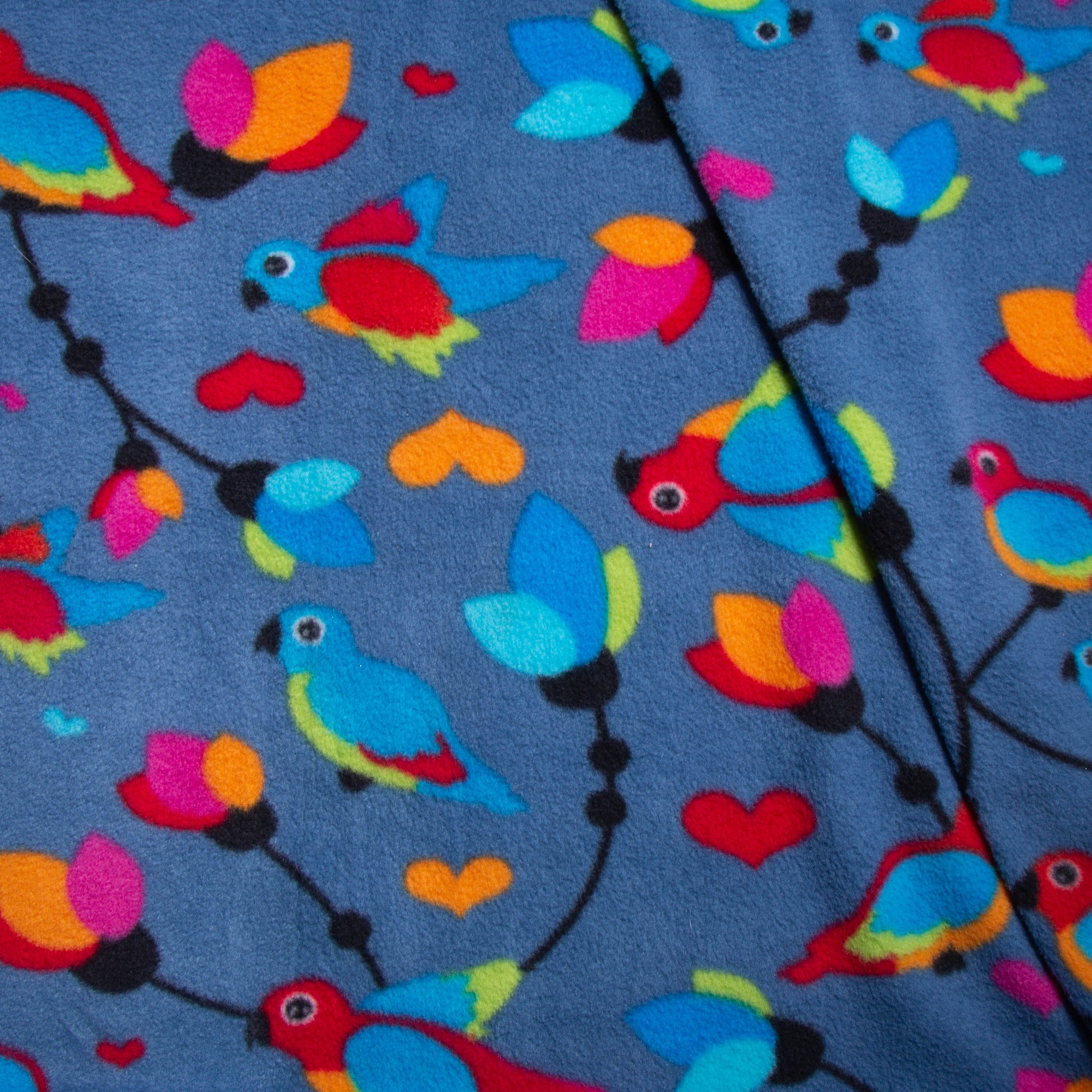 1.50 μ φάρδος. 100% πολυέστερ. Στο φόντο απεικονίζεται παιχνιδιάρικο μοτίβο από πολύχρωμα πουλάκια, φύλλα και καρδιές σε κόκκινες, μπλε, κίτρινες και φούξια αποχρώσεις και μπλε βάση. Ύφασμα μεσαίου πάχους, το οποίο διαθέτει κοντό τρίχωμα. Έχει αρκετή ελαστικότητα ως προς το φάρδος και δεν ξεχειλώνει καθόλου. Είναι ζεστό, πολύ απαλό στην αφή και ανθεκτικό. Μπορεί να χρησιμοποιηθεί, για την ραφή ρούχων, για πιτζάμες, για κουβέρτες, καλύμματα κ.α. Πλένεται στους 30°C