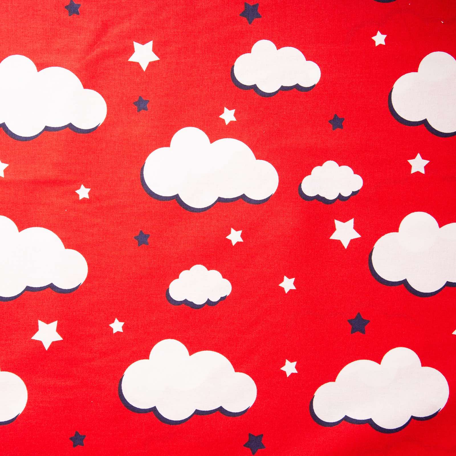 2,40 μ φάρδος. 100% βαμβάκι. Στο φόντο απεικονίζονται λευκά σύννεφα και αστέρια σε διάφορα μεγέθη και βάση σε κόκκινο χρώμα. Είναι πολύ φιλικό προς το δέρμα και το βοηθά να αναπνέει. Χαρακτηρίζεται, επίσης από ανθεκτικότητα και από πολύ μαλακή και απαλή υφή. Προτείνεται ανεπιφύλακτα και για βρέφη. Μπορεί να χρησιμοποιηθεί και για διάφορες κατασκευές όπως νεσεσέρ και τσάντες. Πρέπει να πλυθεί πριν ραφτεί καθώς μαζεύει 2-3%.