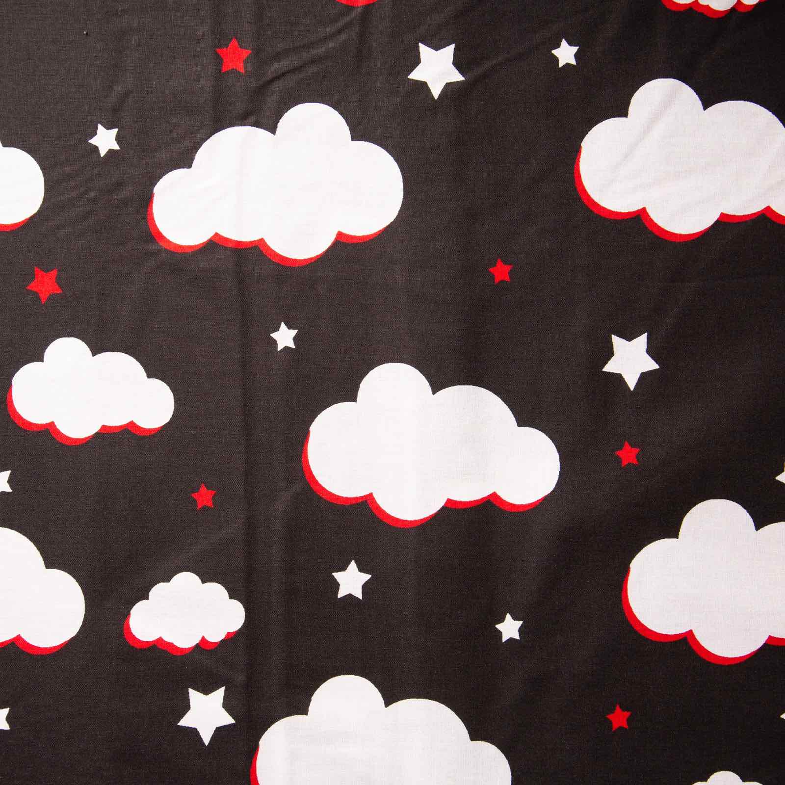 2,40 μ φάρδος. 100% βαμβάκι. Στο φόντο απεικονίζονται λευκά σύννεφα και αστέρια σε διάφορα μεγέθη και βάση σε μαύρο χρώμα. Είναι πολύ φιλικό προς το δέρμα και το βοηθά να αναπνέει. Χαρακτηρίζεται, επίσης από ανθεκτικότητα και από πολύ μαλακή και απαλή υφή. Προτείνεται ανεπιφύλακτα και για βρέφη. Μπορεί να χρησιμοποιηθεί και για διάφορες κατασκευές όπως νεσεσέρ και τσάντες. Πρέπει να πλυθεί πριν ραφτεί καθώς μαζεύει 2-3%.
