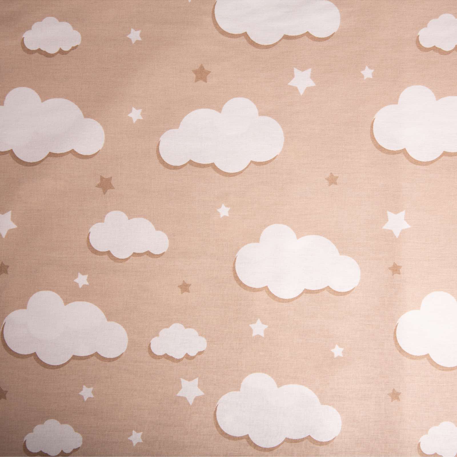 2,40 μ φάρδος. 100% βαμβάκι. Στο φόντο απεικονίζονται λευκά σύννεφα και αστέρια σε διάφορα μεγέθη και βάση σε καφέ χρώμα. Είναι πολύ φιλικό προς το δέρμα και το βοηθά να αναπνέει. Χαρακτηρίζεται, επίσης από ανθεκτικότητα και από πολύ μαλακή και απαλή υφή. Προτείνεται ανεπιφύλακτα και για βρέφη. Μπορεί να χρησιμοποιηθεί και για διάφορες κατασκευές όπως νεσεσέρ και τσάντες. Πρέπει να πλυθεί πριν ραφτεί καθώς μαζεύει 2-3%.