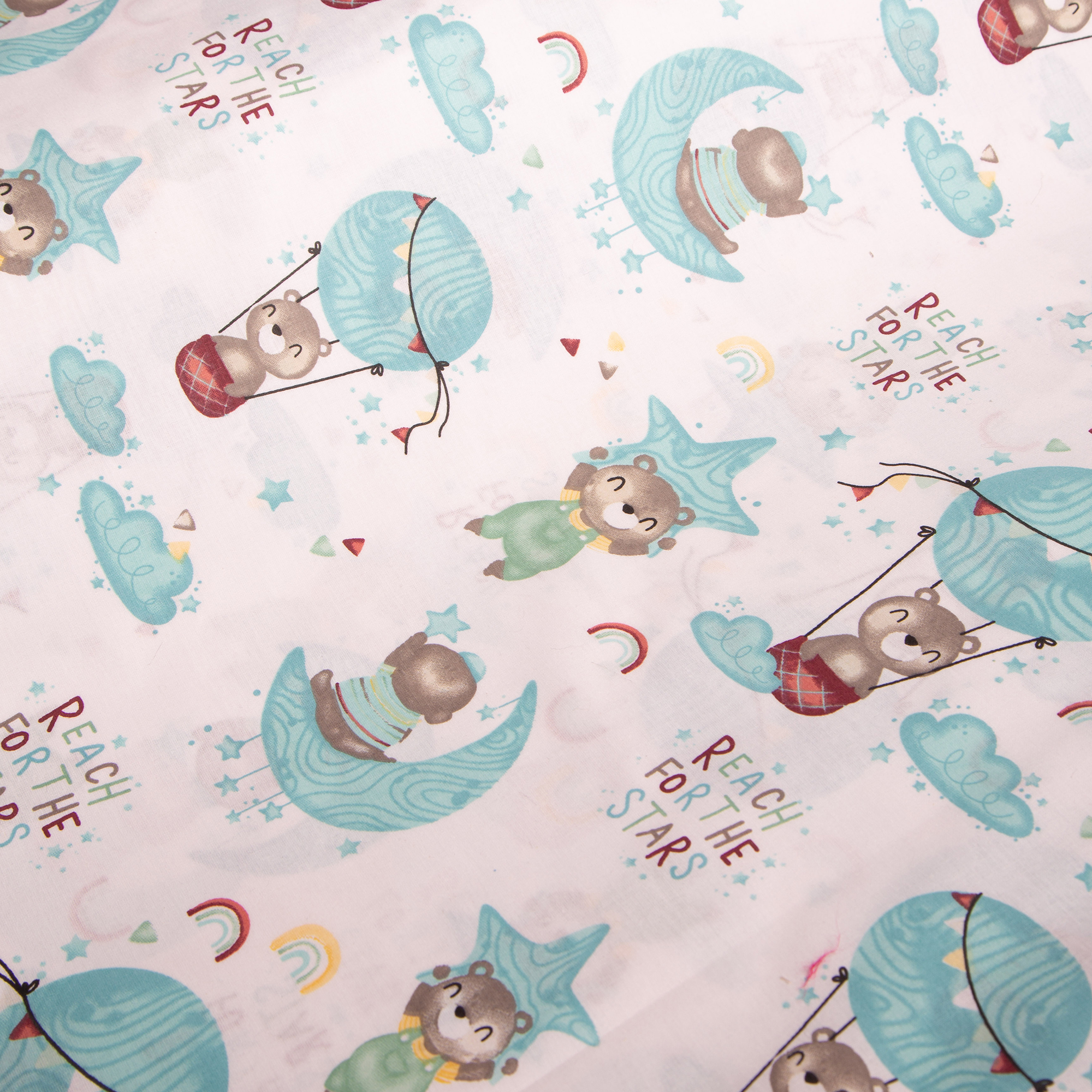 2,40 μ φάρδος. 100% βαμβάκι. Στο φόντο υπάρχει παιδικό σχέδιο σε παστέλ αποχρώσεις με λευκό φόντο. Πιο συγκεκριμένα, απεικονίζονται αρκουδάκια που πέφτουν με αερόστατα πανω σε φεγγάρια και αστέρια. Είναι πολύ φιλικό προς το δέρμα και το βοηθά να αναπνέει. Χαρακτηρίζεται, επίσης από ανθεκτικότητα και από πολύ μαλακή και απαλή υφή. Προτείνεται ανεπιφύλακτα και για βρέφη. Μπορεί να χρησιμοποιηθεί και για διάφορες κατασκευές όπως νεσεσέρ και τσάντες. Πρέπει να πλυθεί πριν ραφτεί καθώς μαζεύει 2-3%.