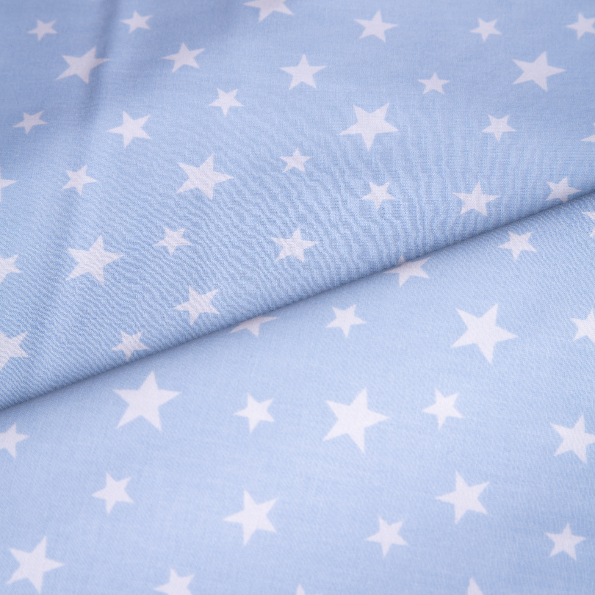 2,40 μ φάρδος. 100% βαμβάκι. Στο φόντο απεικονίζονται άσπρα αστέρια διάσπαρτα σε όλη την επιφάνεια και βάση σε γαλάζιο χρώμα. Είναι πολύ φιλικό προς το δέρμα και το βοηθά να αναπνέει. Χαρακτηρίζεται, επίσης από ανθεκτικότητα και από πολύ μαλακή και απαλή υφή. Προτείνεται ανεπιφύλακτα και για βρέφη. Μπορεί να χρησιμοποιηθεί και για διάφορες κατασκευές όπως νεσεσέρ και τσάντες. Πρέπει να πλυθεί πριν ραφτεί καθώς μαζεύει 2-3%.