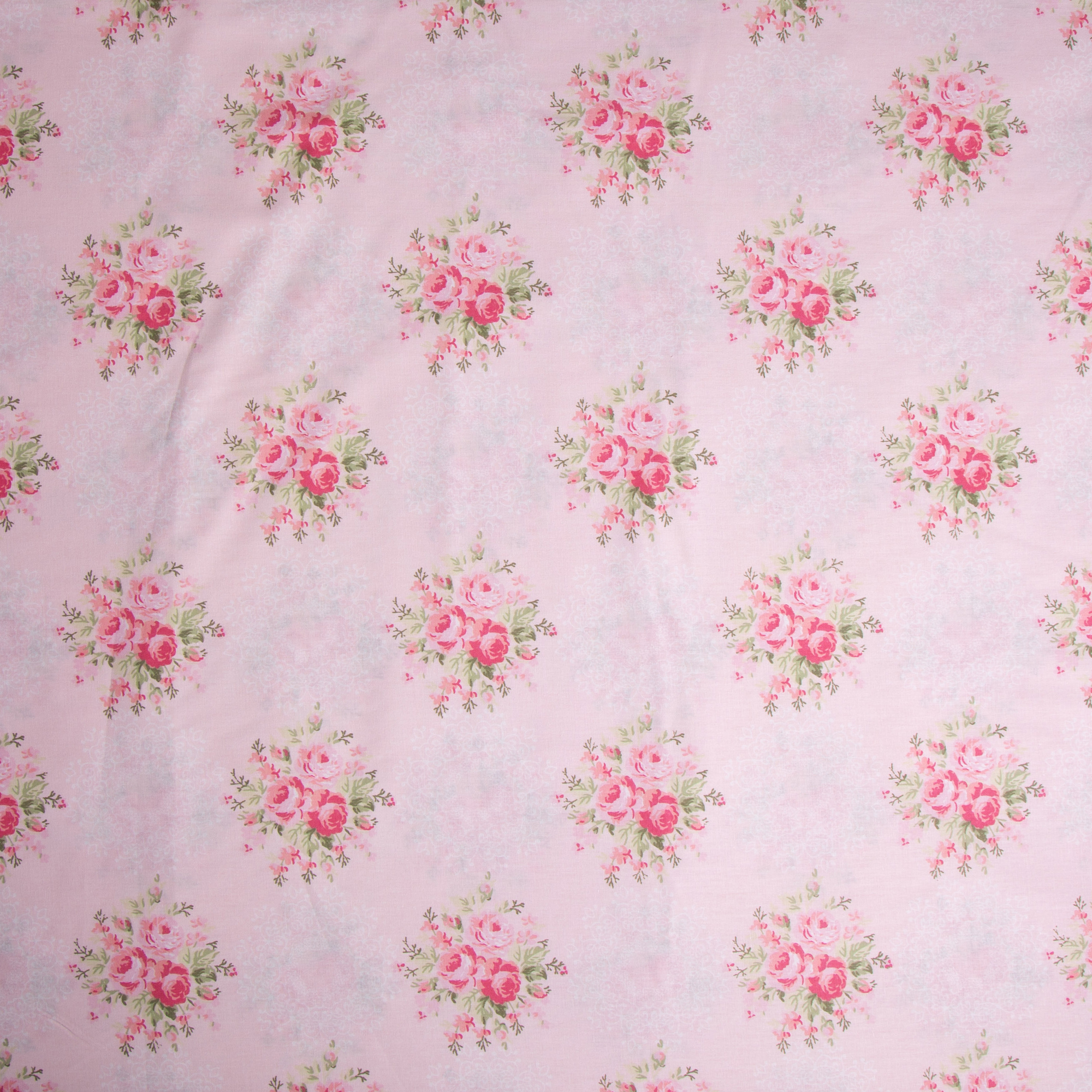 2,40 μ φάρδος. 100% βαμβάκι. Στο φόντο απεικονίζονται επαναλαμβανόμενες ανθοδέσμες αποτελούμενες από ροζ και φούξια τριαντάφυλλα και βαση σε παστέλ ροζ. Είναι πολύ φιλικό προς το δέρμα και το βοηθά να αναπνέει. Χαρακτηρίζεται, επίσης από ανθεκτικότητα και από πολύ μαλακή και απαλή υφή. Προτείνεται ανεπιφύλακτα και για βρέφη. Μπορεί να χρησιμοποιηθεί και για διάφορες κατασκευές όπως νεσεσέρ και τσάντες. Πρέπει να πλυθεί πριν ραφτεί καθώς μαζεύει 2-3%.