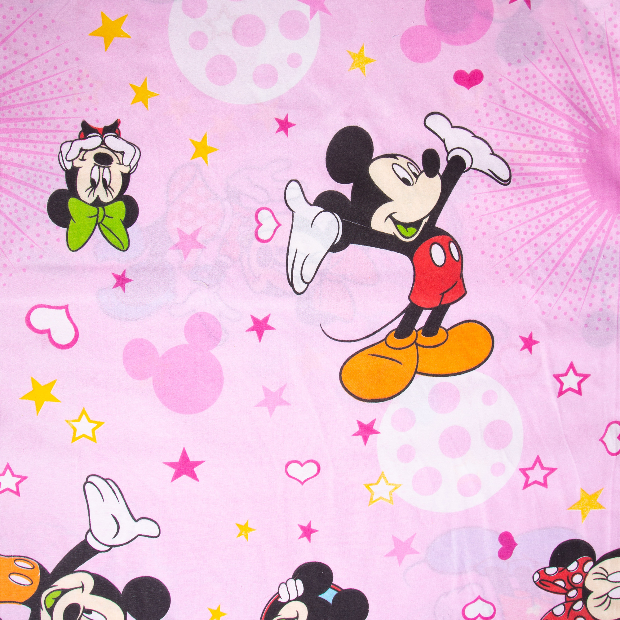 2,40 μ φάρδος. 100% βαμβάκι. Στο φόντο απεικονίζονται χρωματιστές φιγούρες Mickey και Minnie με καρδιές και αστέρια σε ροζ φόντο. Είναι πολύ φιλικό προς το δέρμα και το βοηθά να αναπνέει. Χαρακτηρίζεται, επίσης από ανθεκτικότητα και από πολύ μαλακή και απαλή υφή. Προτείνεται ανεπιφύλακτα και για βρέφη. Μπορεί να χρησιμοποιηθεί και για διάφορες κατασκευές όπως νεσεσέρ και τσάντες. Πρέπει να πλυθεί πριν ραφτεί καθώς μαζεύει 2-3%.