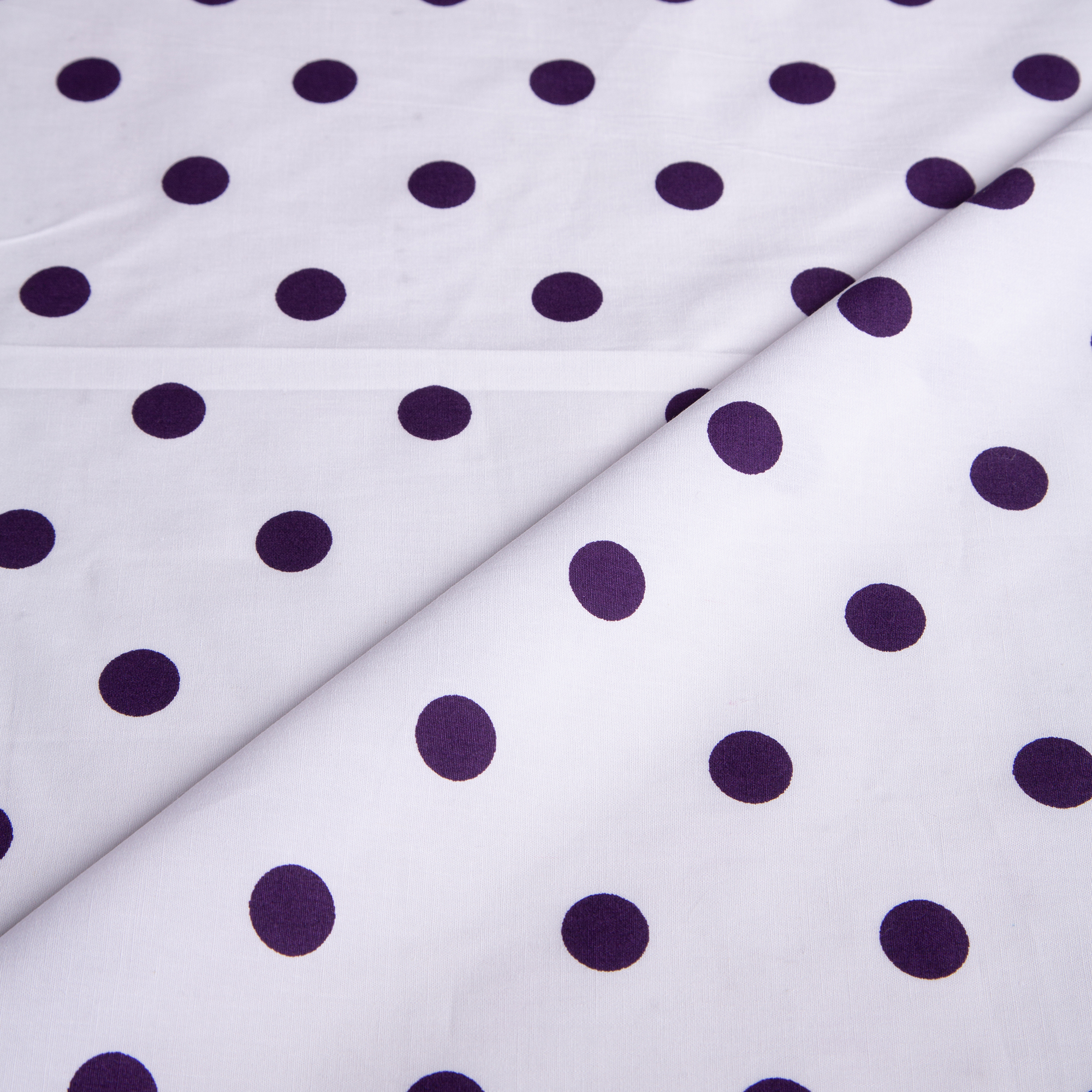 1,50 μ φάρδος. 100% βαμβάκι. Στο συγκεκριμένο σχέδιο απεικονίζεται πουά σε αποχρώσεις του σκούρου μωβ και του λευκού. Τα κυριότερα χαρακτηριστικά της ποπλίνας είναι η απαλή της υφή, η ελαφρότητα της και η εξαιρετική διαπνοή που προσφέρει. Δημιουργεί μια πολύ ευχάριστη αίσθηση κατά την επαφή με το δέρμα κάτι που την καθιστά κατάλληλη για ραφές που απαιτούν άνεση και κομψότητα. Συνιστάται πλύσιμο σε χαμηλούς βαθμούς.